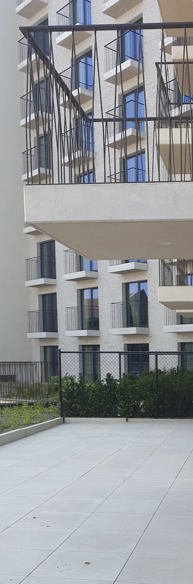 Ontspan op het ruime terras met zicht op de groene omgeving. Het gebouw combineert hedendaagse architectuur met praktische voorzieningen zoals een lift, fietsenstalling en gemeenschappelijke fitnessruimte.