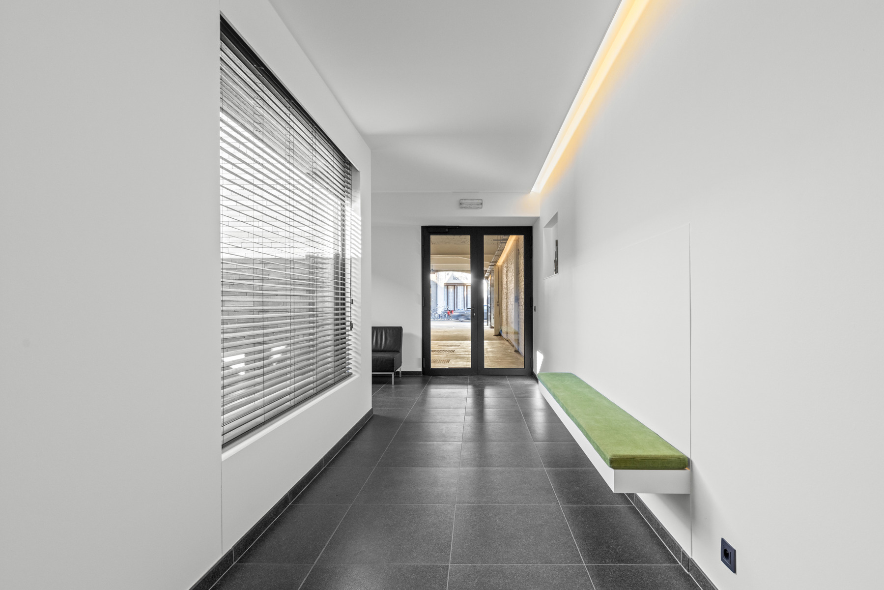 We komen binnen via een ruime, overdekte parking met plaats voor 7 wagens. Vanuit de parking betreden we de langgerekte inkomhal die leidt naar het volledig gerenoveerde kantoor (2017), ingedeeld met een vergaderruimte met zicht op de binnentuin, burelen, keuken en sanitaire voorzieningen.
