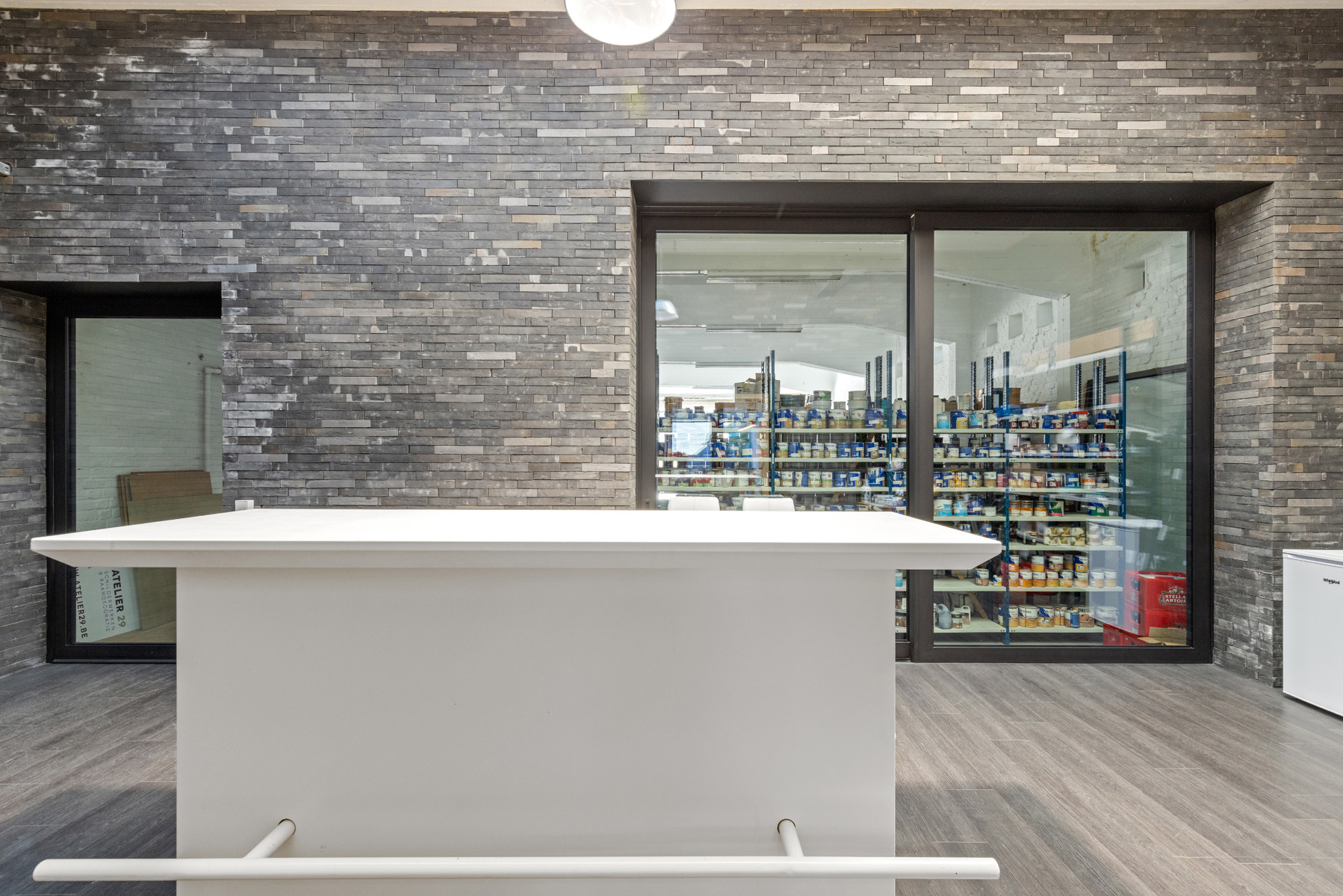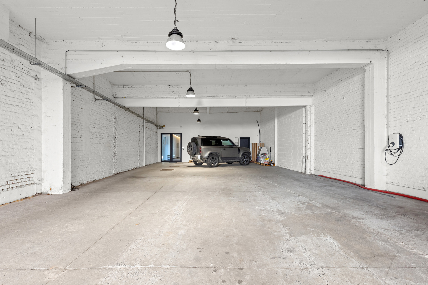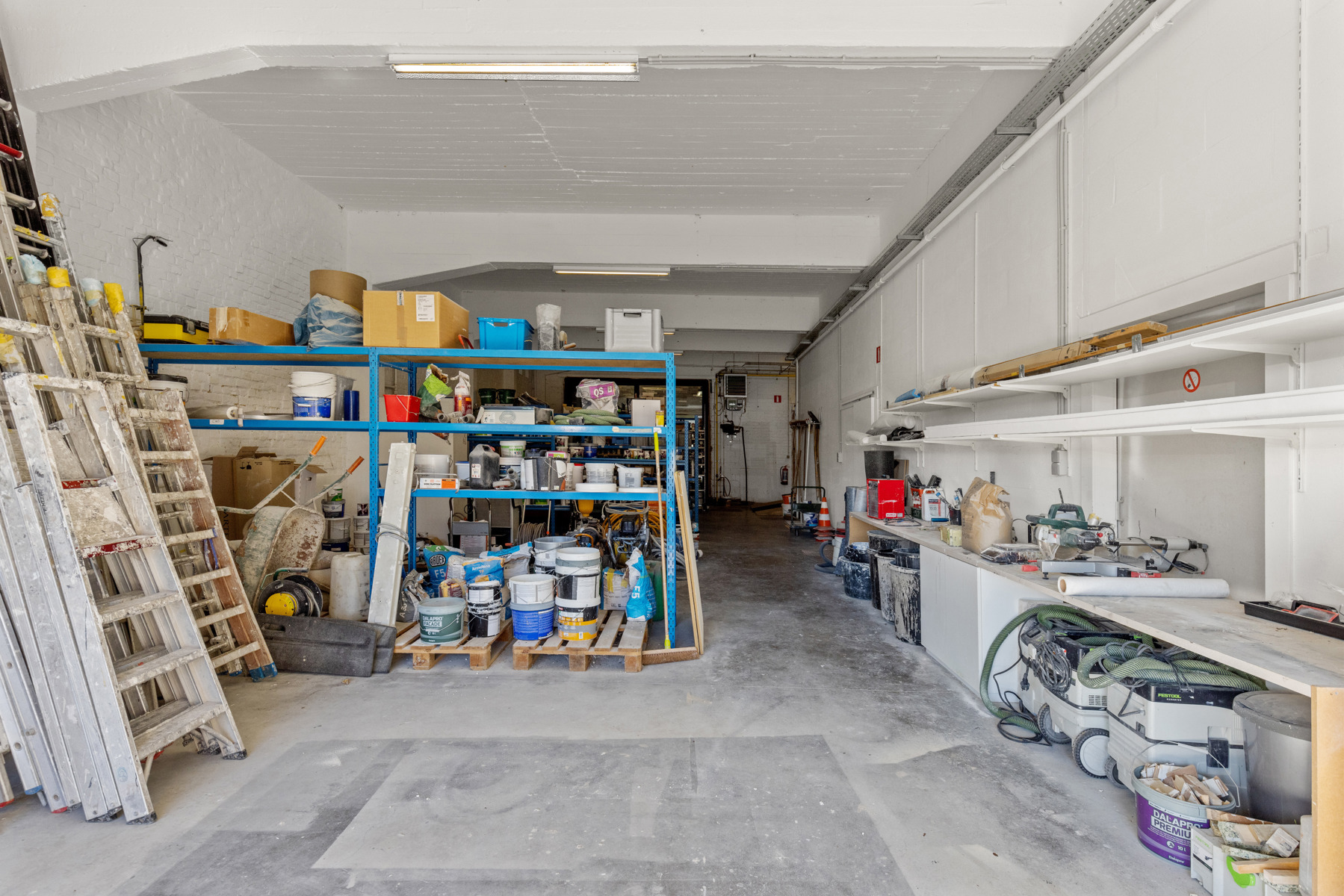 Achteraan bevindt zich een groot atelier met eigen sanitair en een buitenruimte. Boven de atelier vinden we een polyvalente ruimte van 174 m², kan ingericht worden als extra kantoorruimte of als bijkomende wooneenheid.