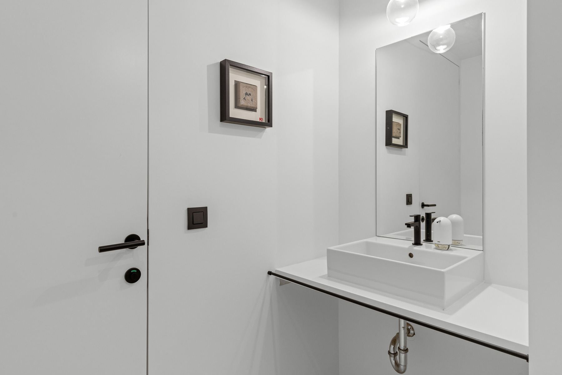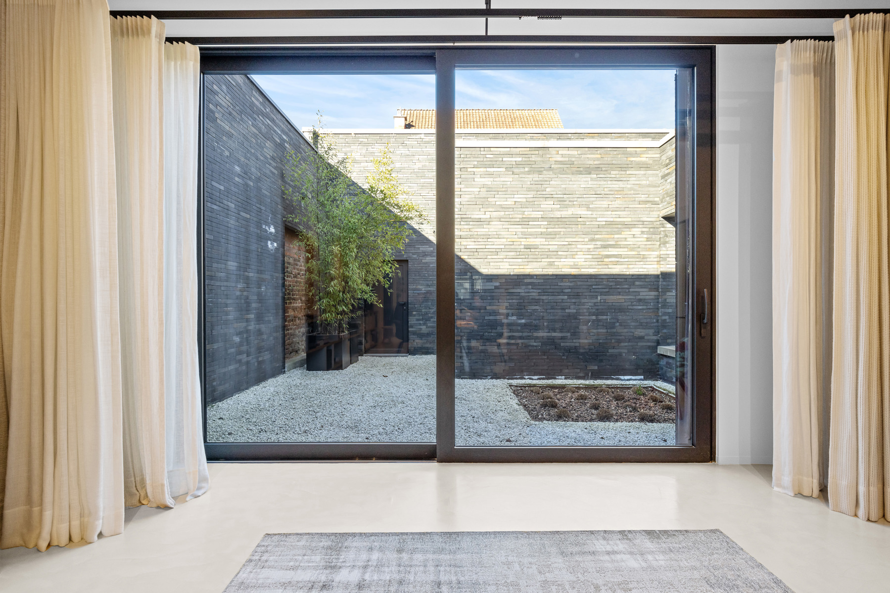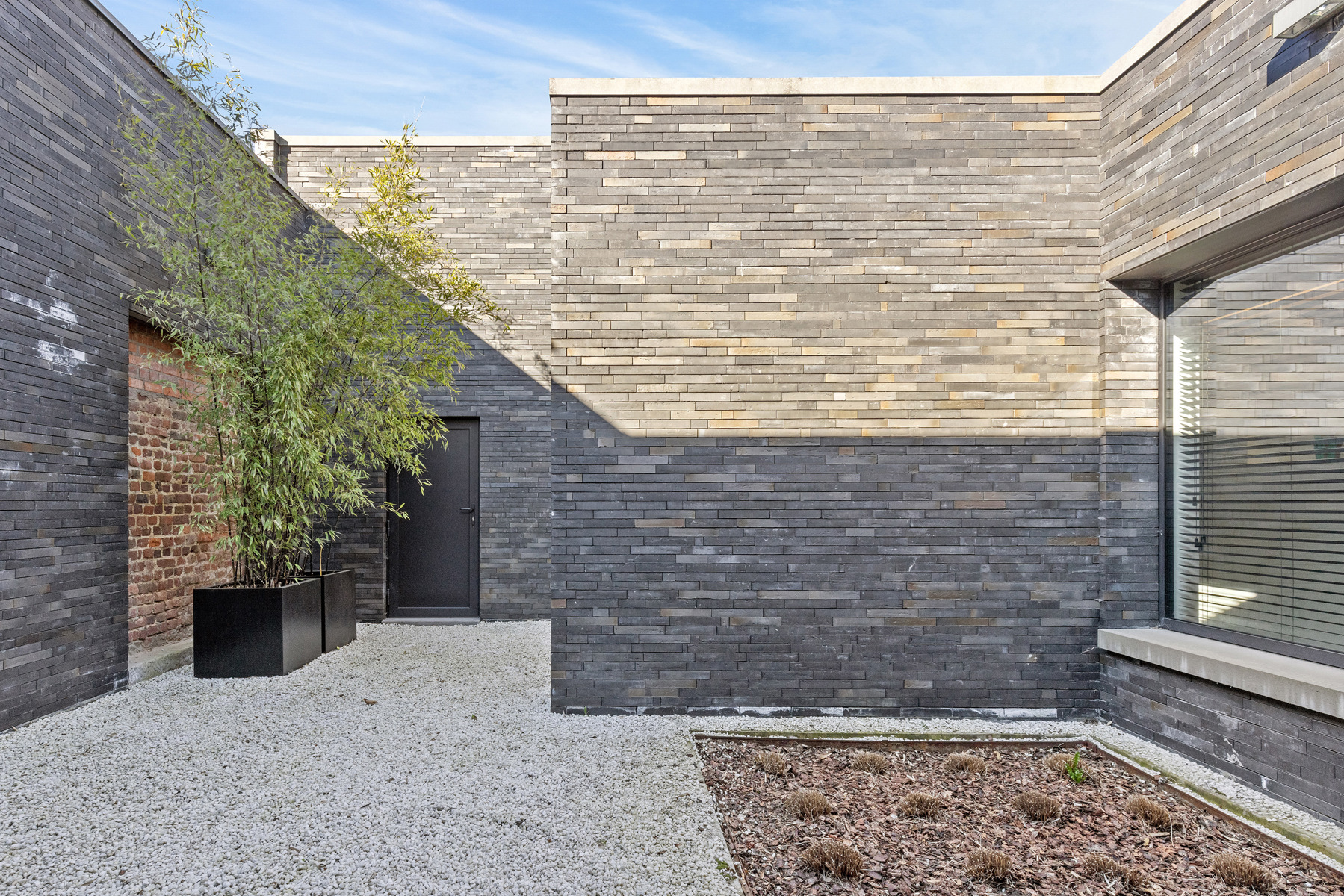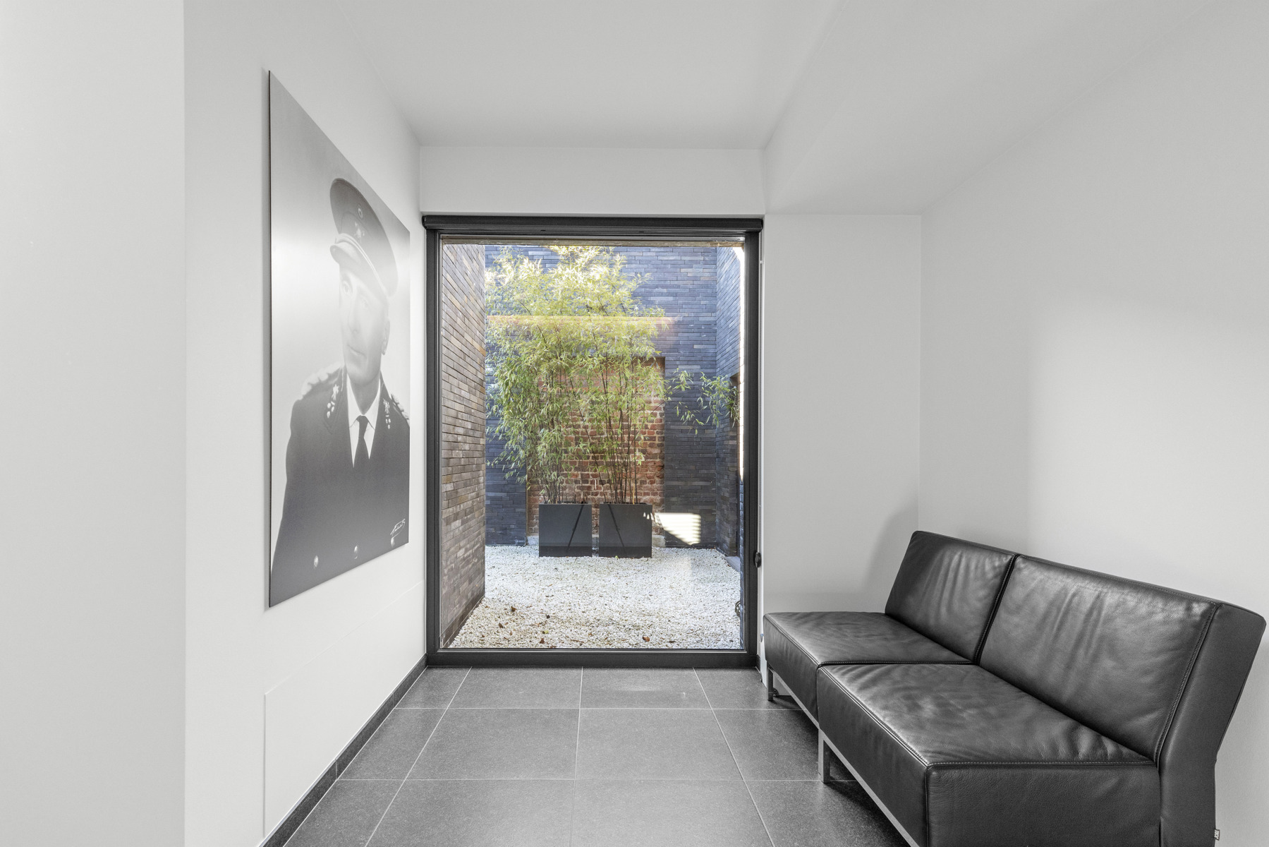Achteraan bevindt zich een groot atelier met eigen sanitair en een buitenruimte. Boven de atelier vinden we een polyvalente ruimte van 174 m², kan ingericht worden als extra kantoorruimte of als bijkomende wooneenheid.