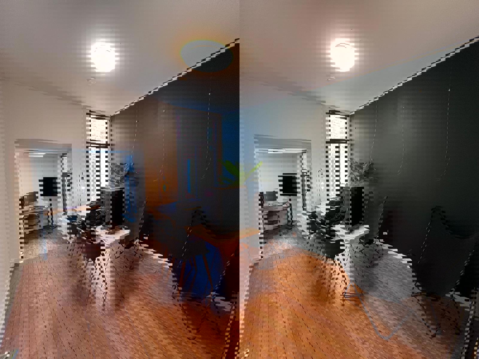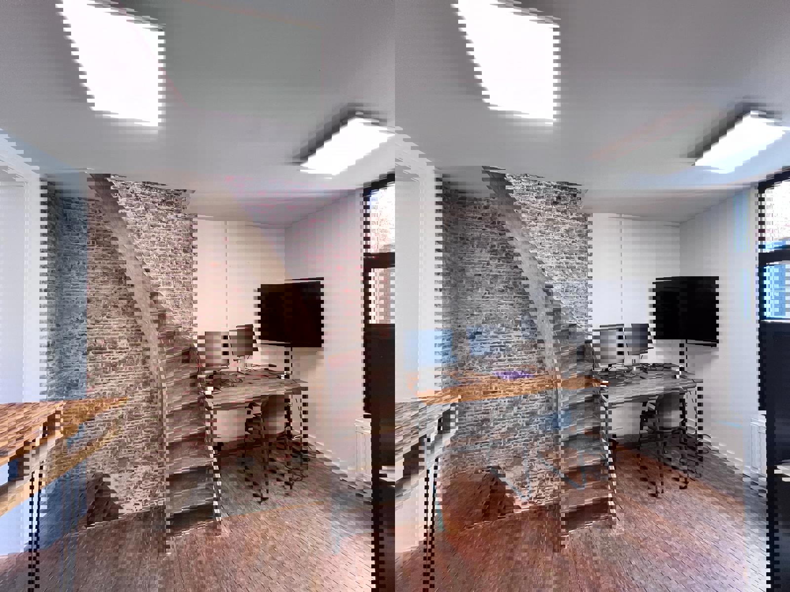 Dit authentieke pand combineert charme met modern comfort: parketvloeren en een beton gegoten trap creëren een warme, inspirerende werkplek die ver afstaat van het klassieke, kille kantoor.