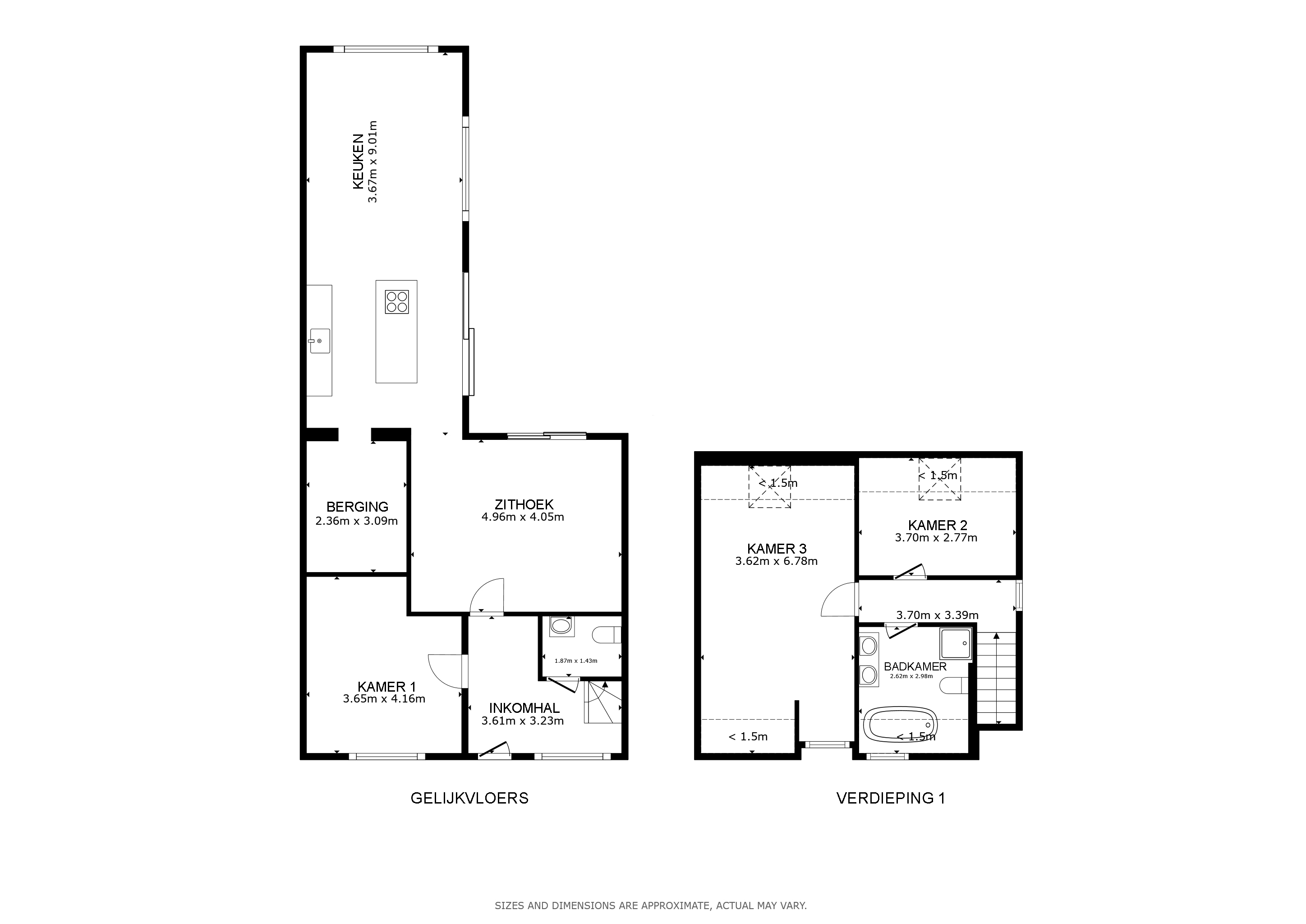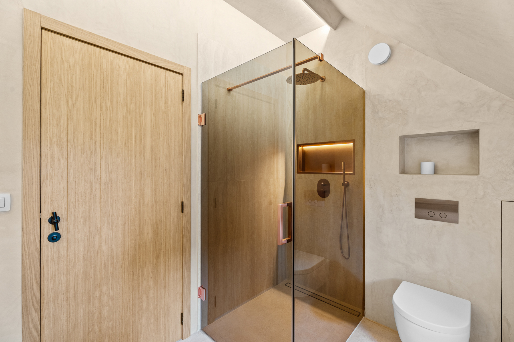 Op de verdieping bevinden zich twee volwaardige slaapkamers en een unieke badkamer, afgewerkt met karaktervolle balkenstructuur en Mortex. Geniet van een luxueuze inloopdouche, ligbad, dubbele lavabo én een extra toilet – alles in een warme, moderne sfeer.