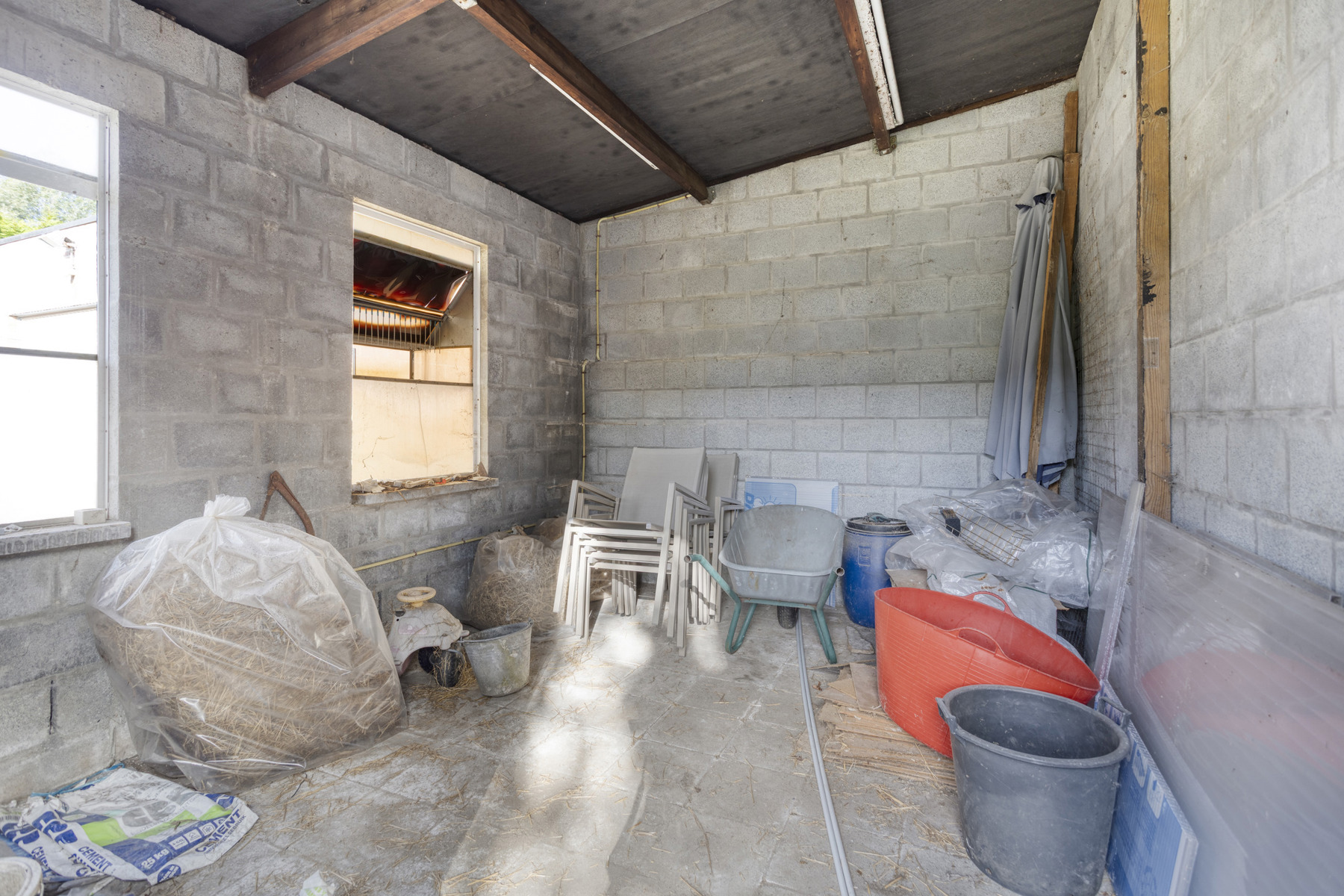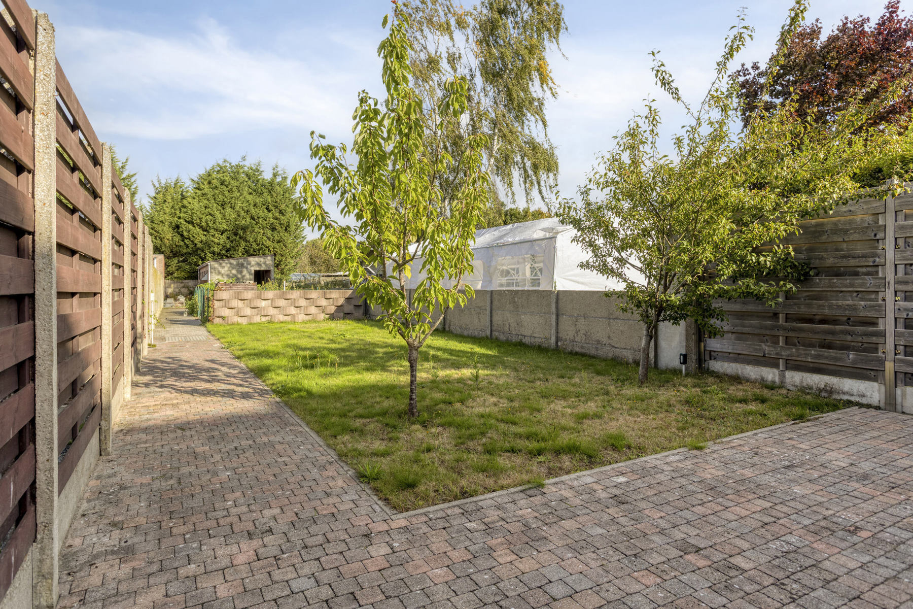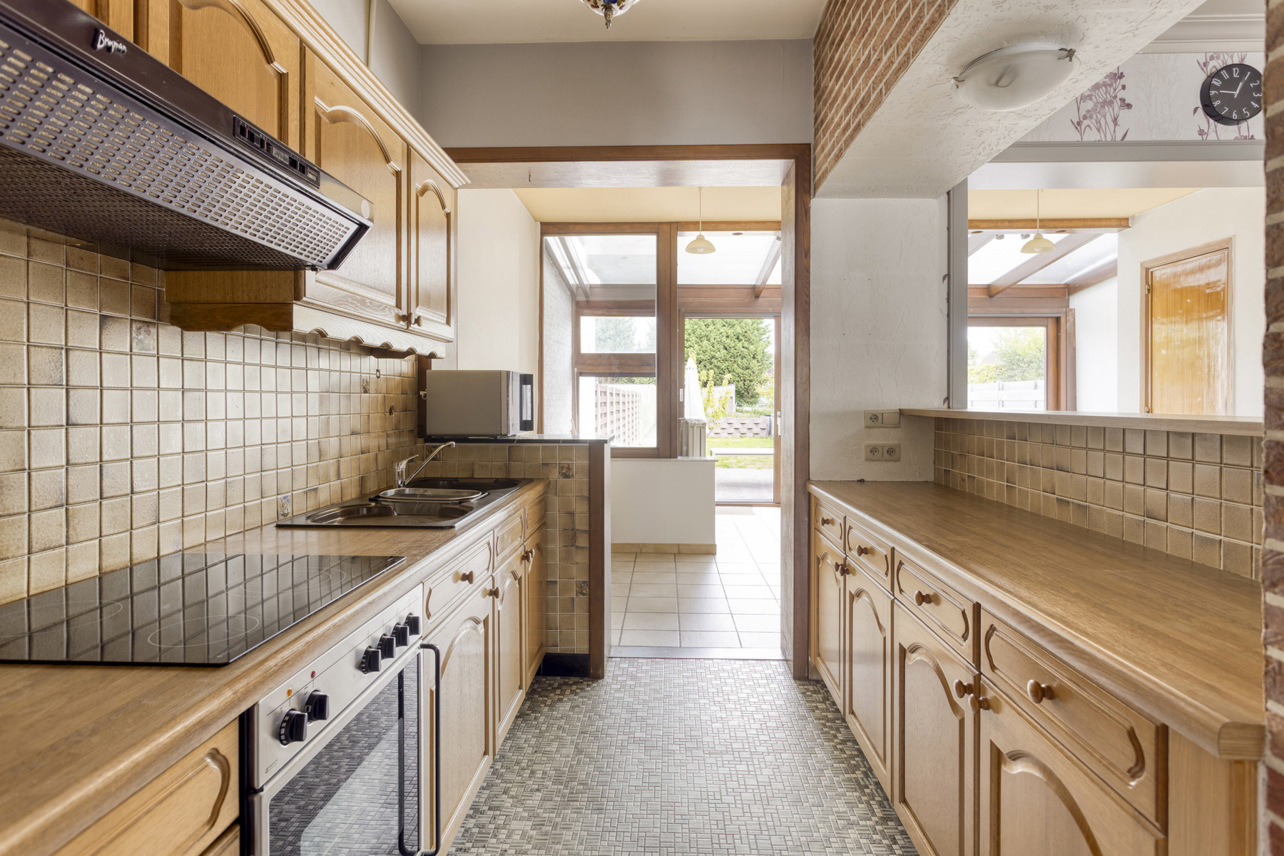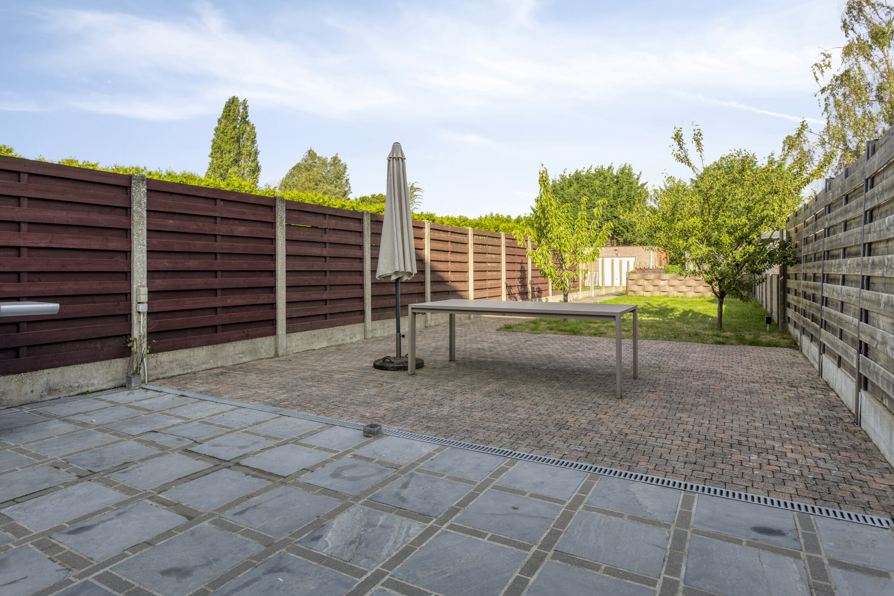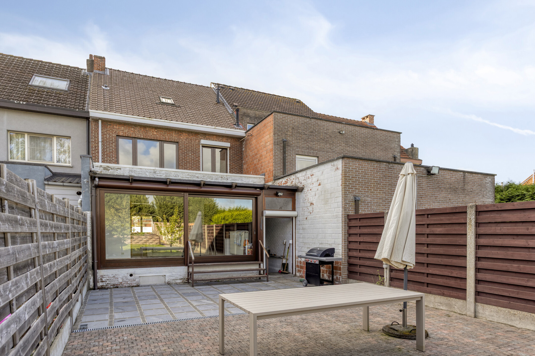 De inkomhal leidt naar een gezellige leefruimte met salon en eetkamer, in directe verbinding met de keuken. Aansluitend nodigt een lichtrijke veranda uit om te genieten van het uitzicht op de onderhoudsvriendelijke tuin met terras en groene zone. Hier is ook een handige berging of werkplaats aanwezig.