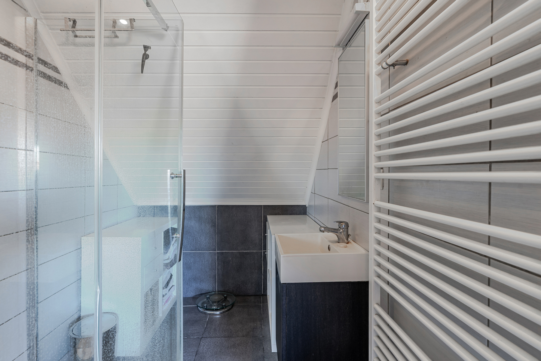 De inkomhal met gastentoilet leidt je naar een lichtrijke leefruimte die uitmondt op een ruim terras. Je voelt meteen hoe binnen en buiten hier in elkaar overvloeien. Op de bovenverdieping ontdek je twee slaapkamers en een badkamer – praktisch, gezellig en perfect ingedeeld.
