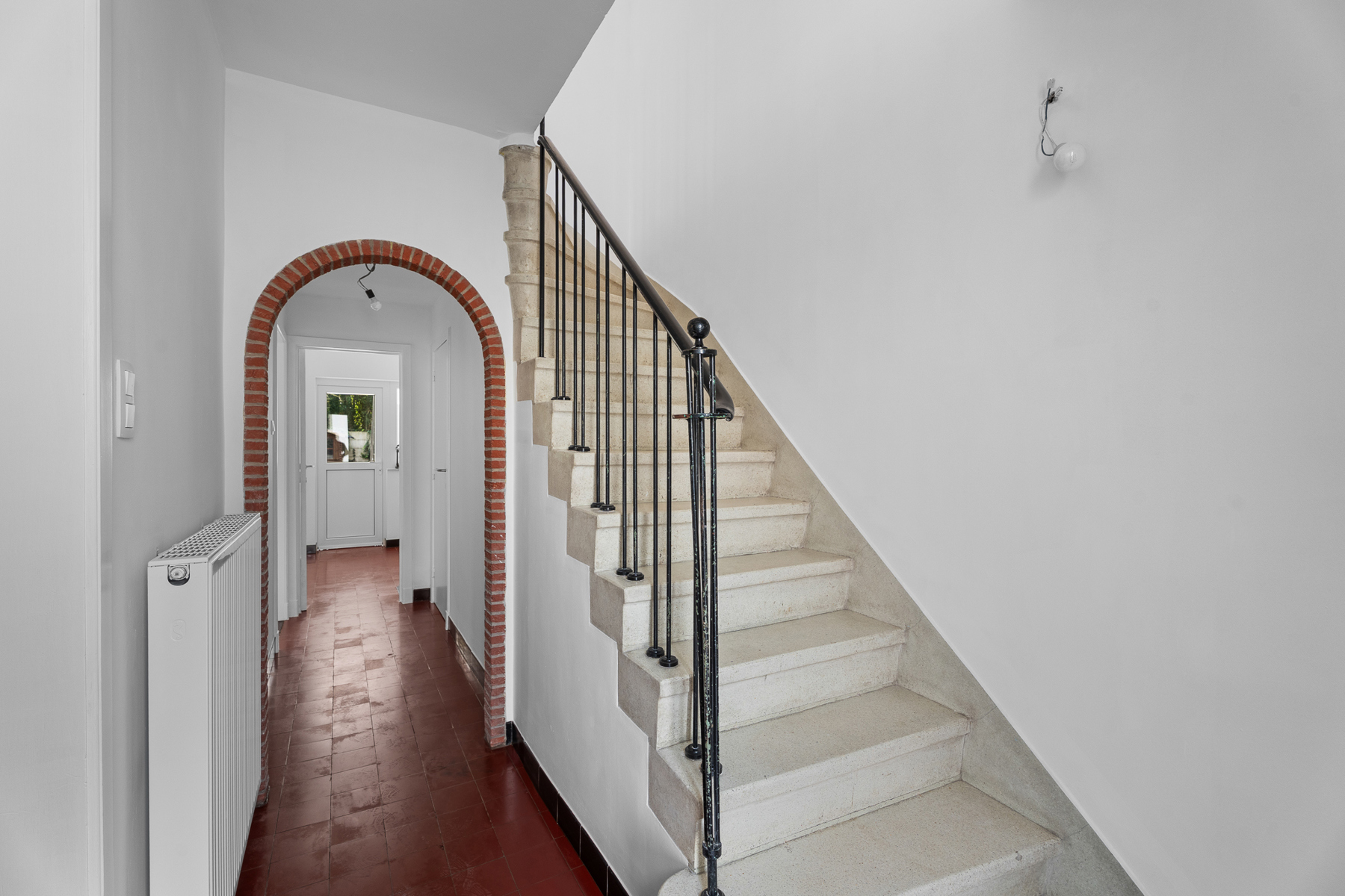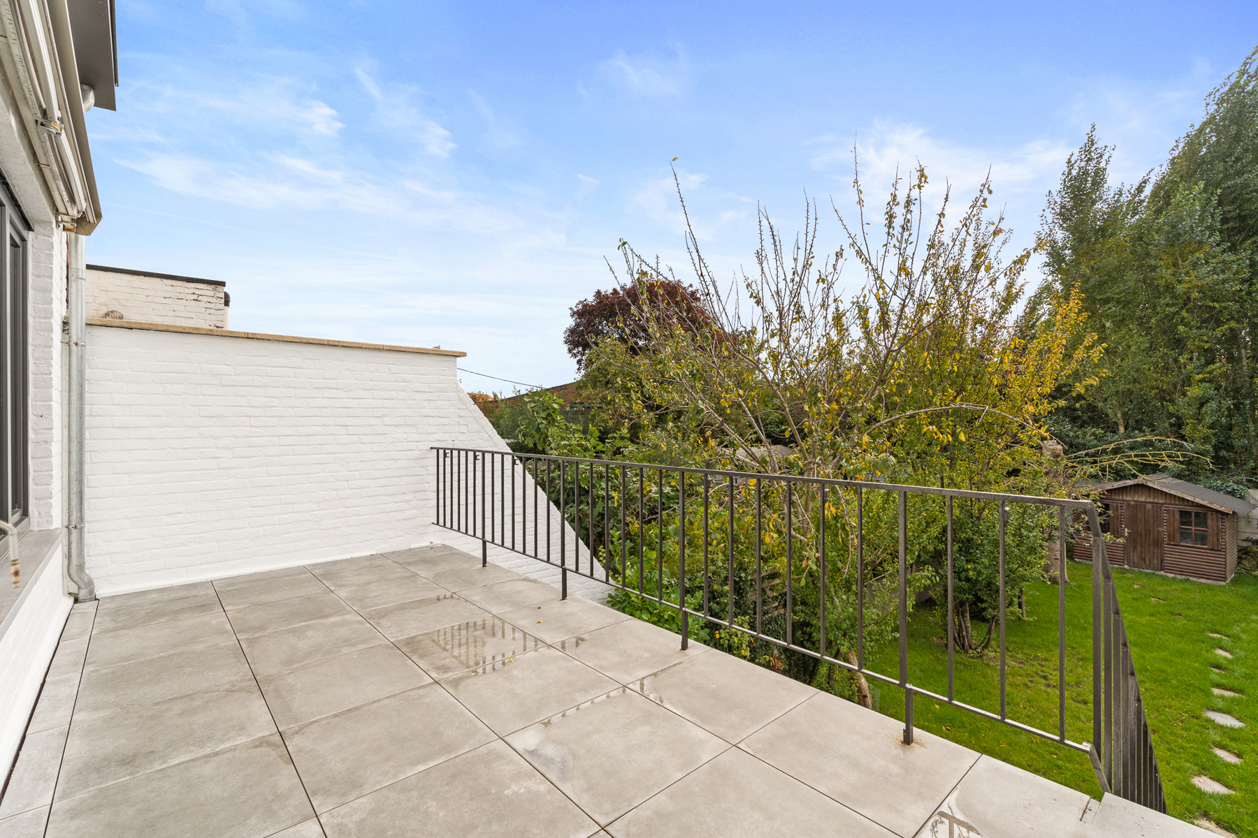 1ste verdieping: lichtrijke leefruimte met aansluitend een afzonderlijke keuken met een aangenaam terras met zicht op de tuin en een gastentoilet in de traphal.