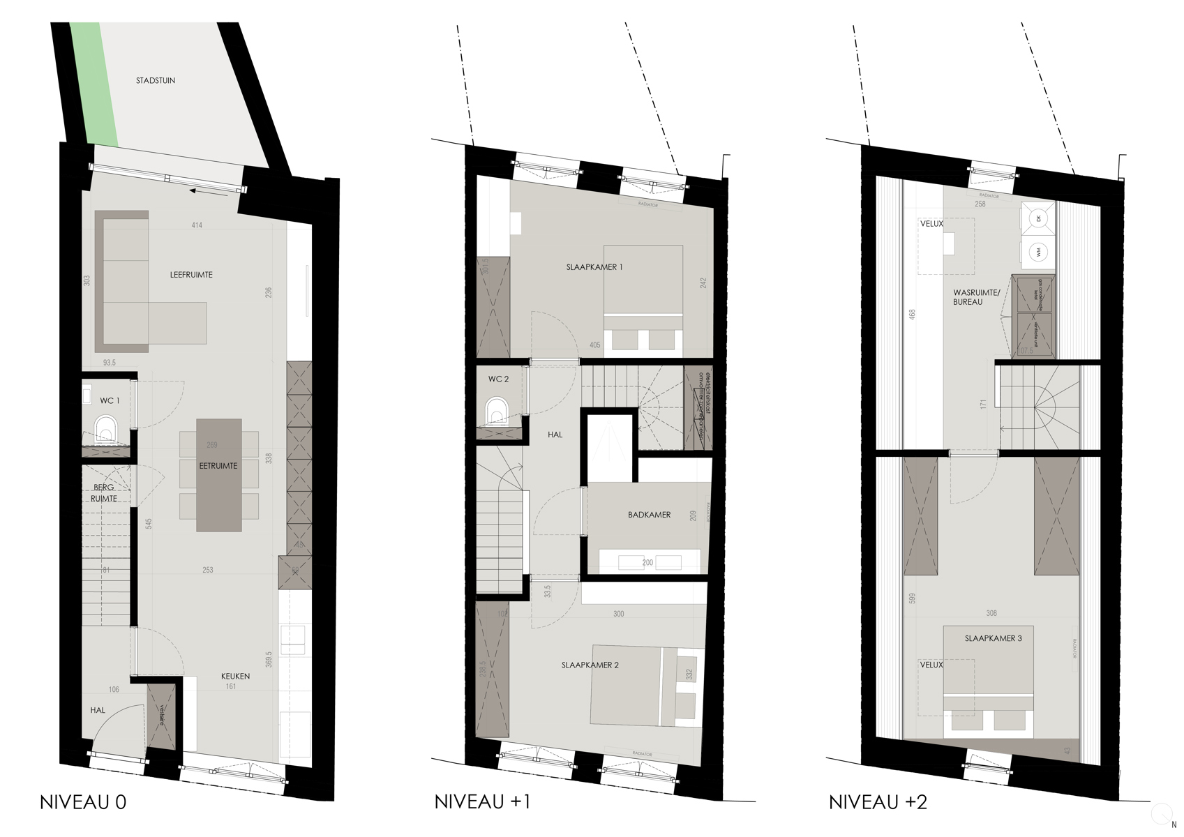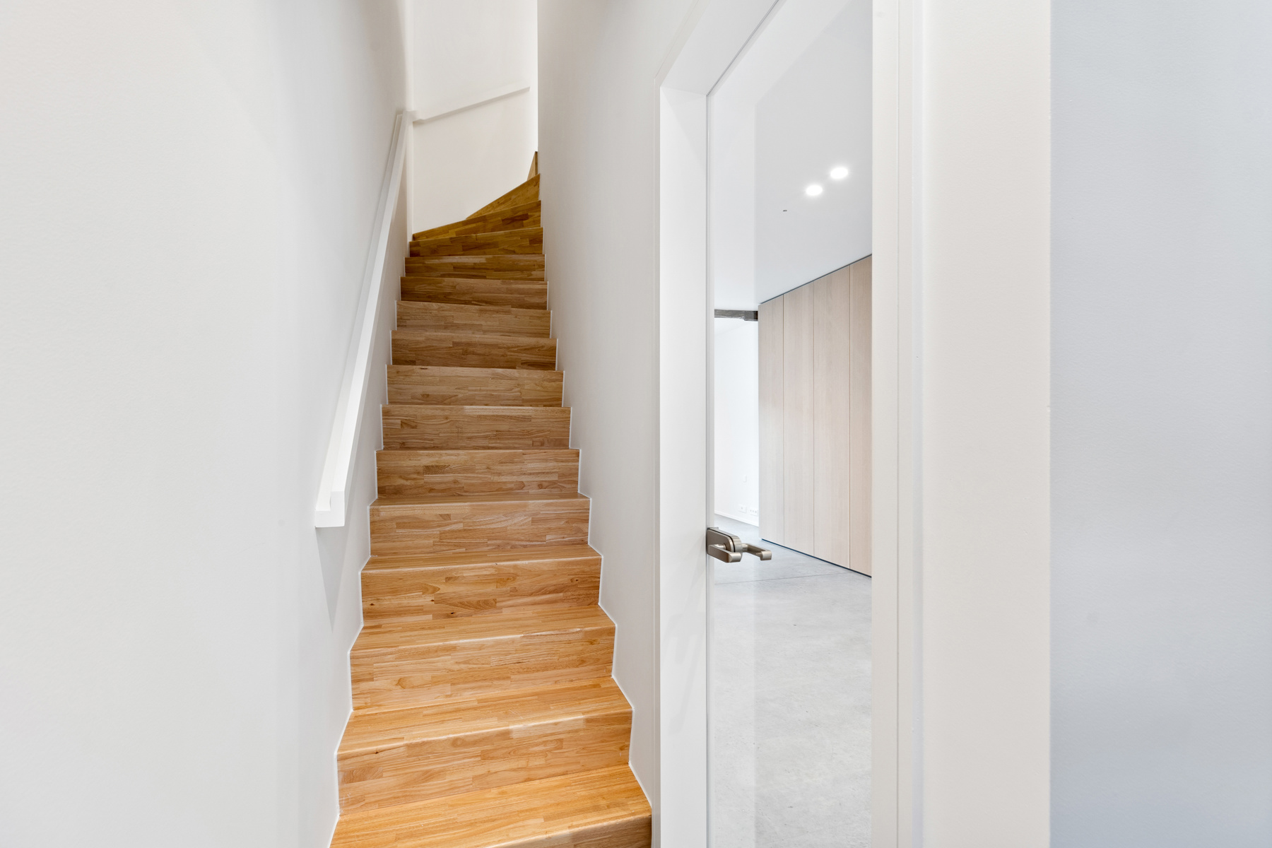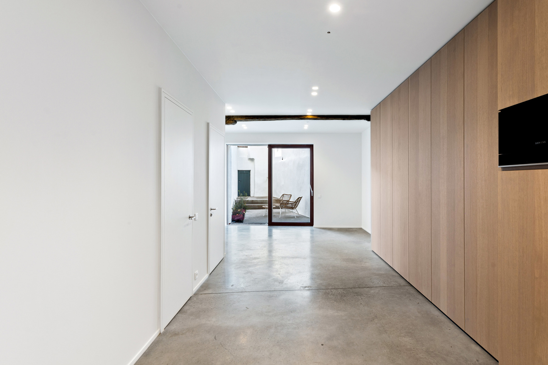 Op het gelijkvloers kom je binnen via een inkom- en trappenhal die uitgeeft op de open keuken en lichtrijke leefruimte. Grote raampartijen zorgen voor een mooie connectie met het zuidwestgericht terras, een echte meerwaarde in de stad. Verder zijn er een berging en een afzonderlijk gastentoilet.