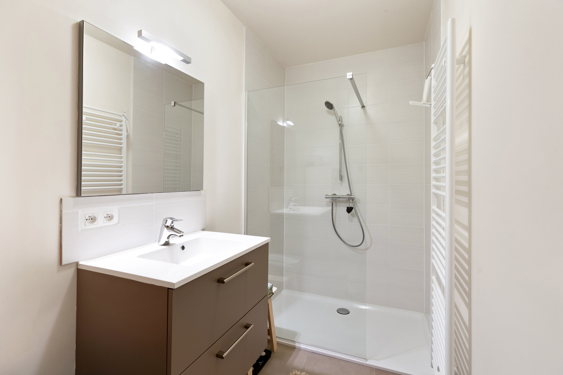Een ruime slaapkamer en een praktisch en stijlvol ingerichte badkamer met 1 persoonswastafel en douche.