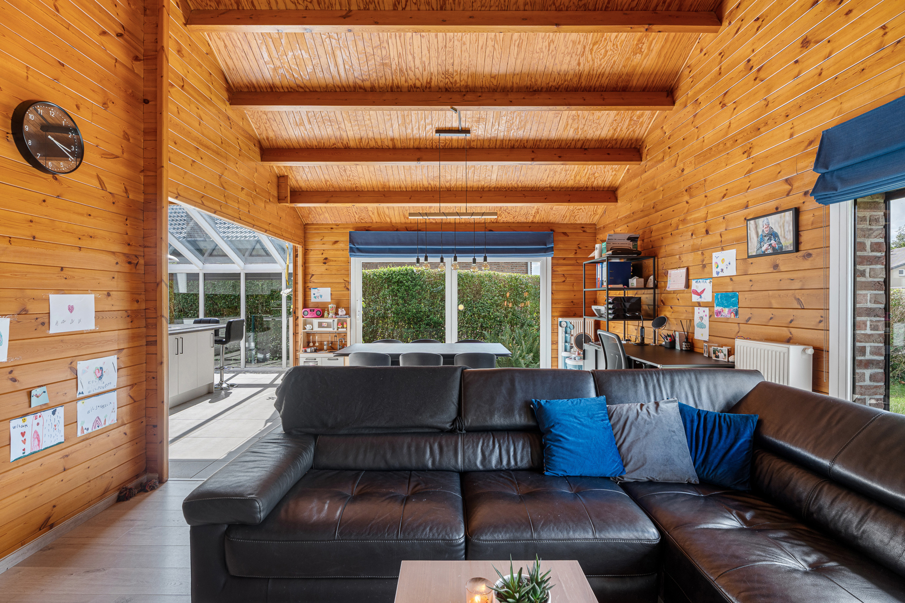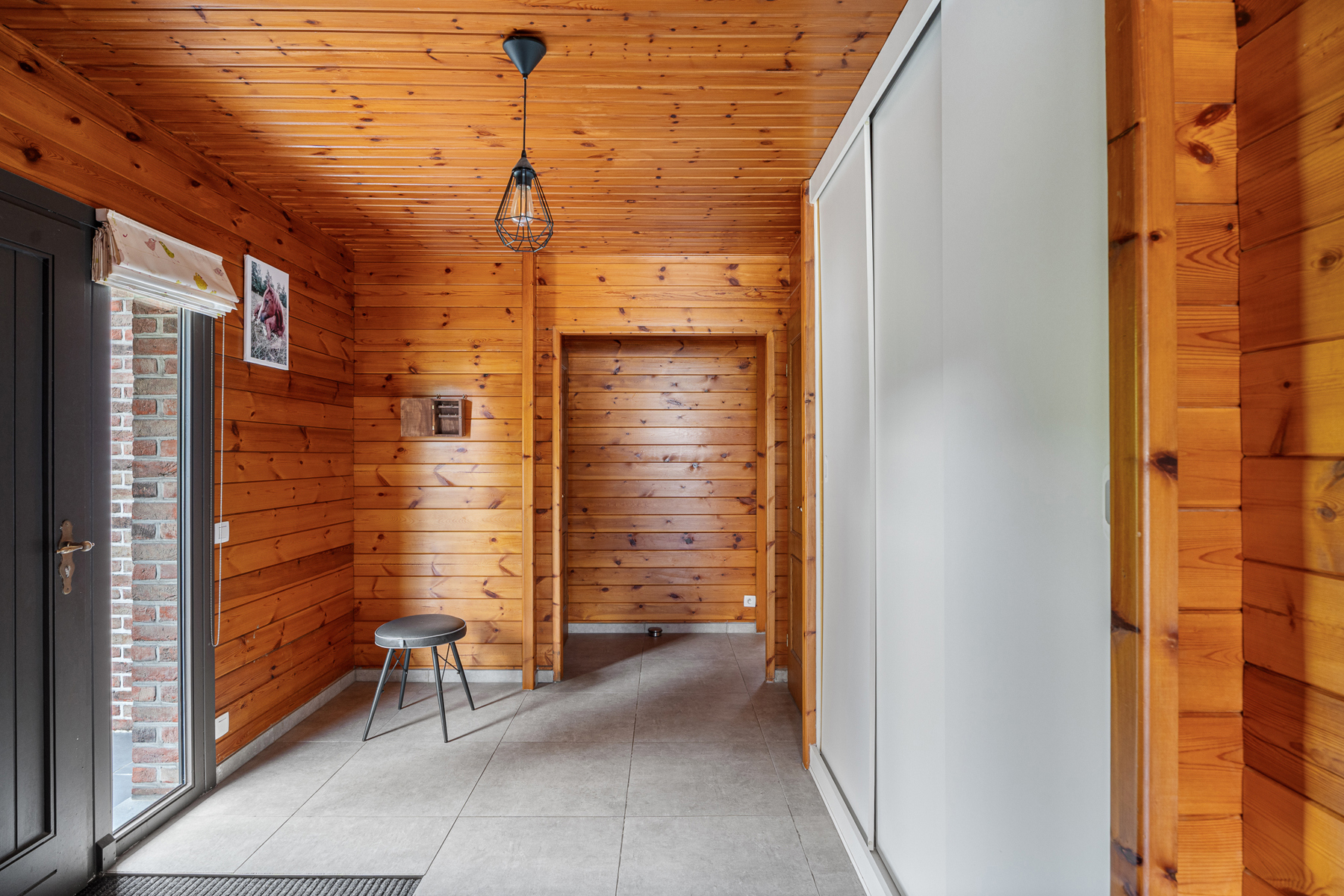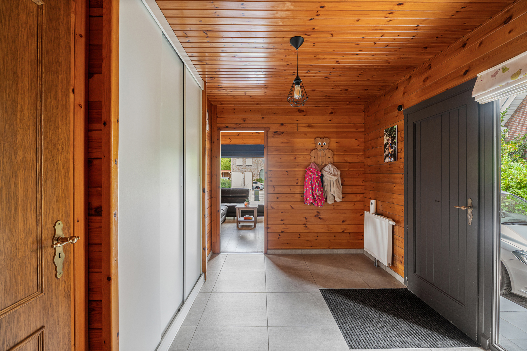 Gelijkvloers (109 m²) met massieve houten wanden en inpandige garage voor 2 wagens, plus oprit voor 3 extra auto’s. De kelder van nog eens 109 m² biedt uitbreidingspotentieel: extra slaapkamers, badkamer, atelier of hobbyruimte?