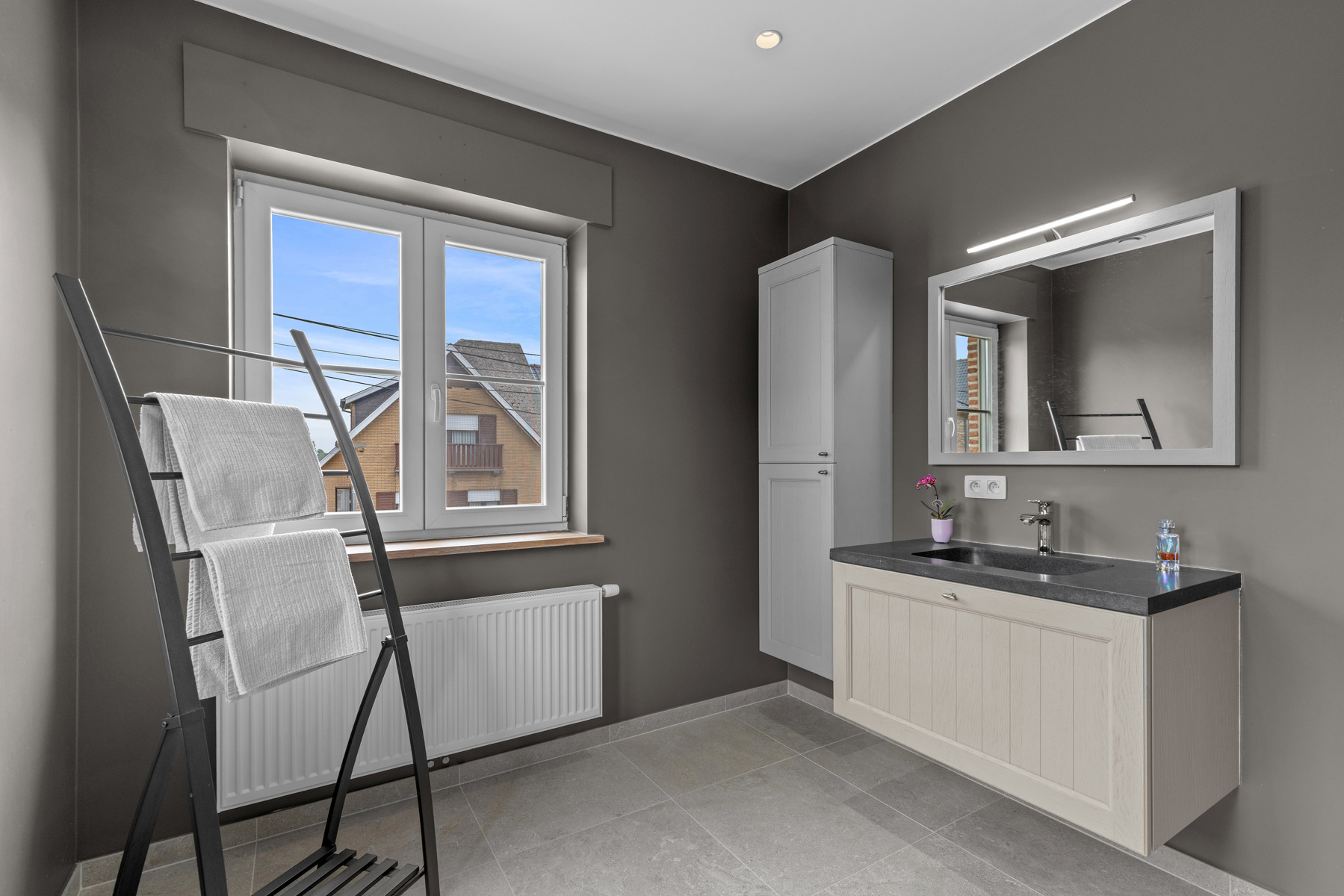 De woning omvat op het gelijkvloers een ruime inkomhal met gastentoilet, een wasruimte, een douchekamer, een open leefruimte met zit- en eethoek en een volledig uitgeruste keuken met zicht op de tuin. Aansluitend vind je de inpandige garage voor twee wagens.