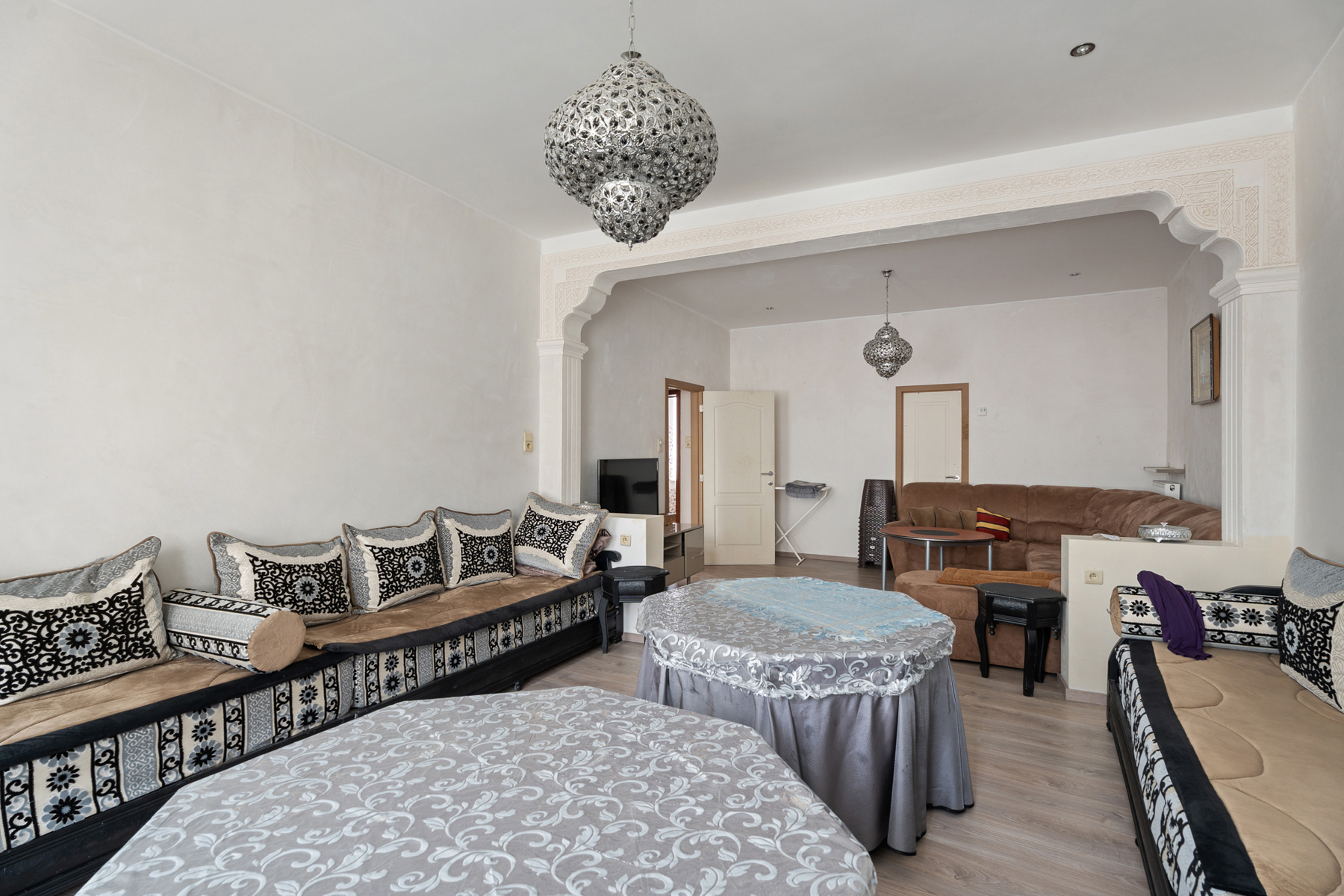 Binnen ademt de woning karakter, met hoge plafonds die het ruimtelijke gevoel versterken en originele houten vloeren die warmte en charme toevoegen. De grote kamers laten zich vlot herinrichten naar uw wensen, terwijl de indeling en oppervlakte eindeloze mogelijkheden bieden.