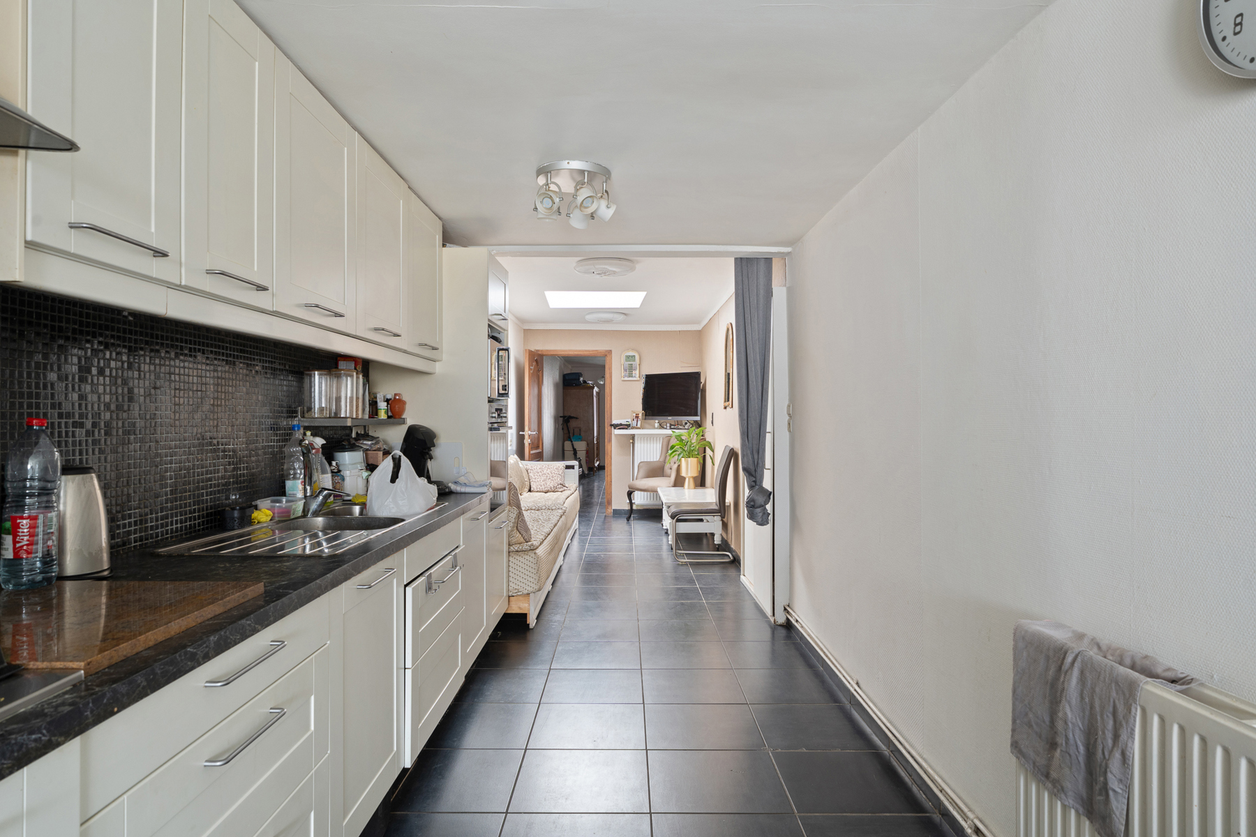 Gelijkvloers: inkomhal, volledig ingerichte leefkeuken met toegang tot koer, badkamer