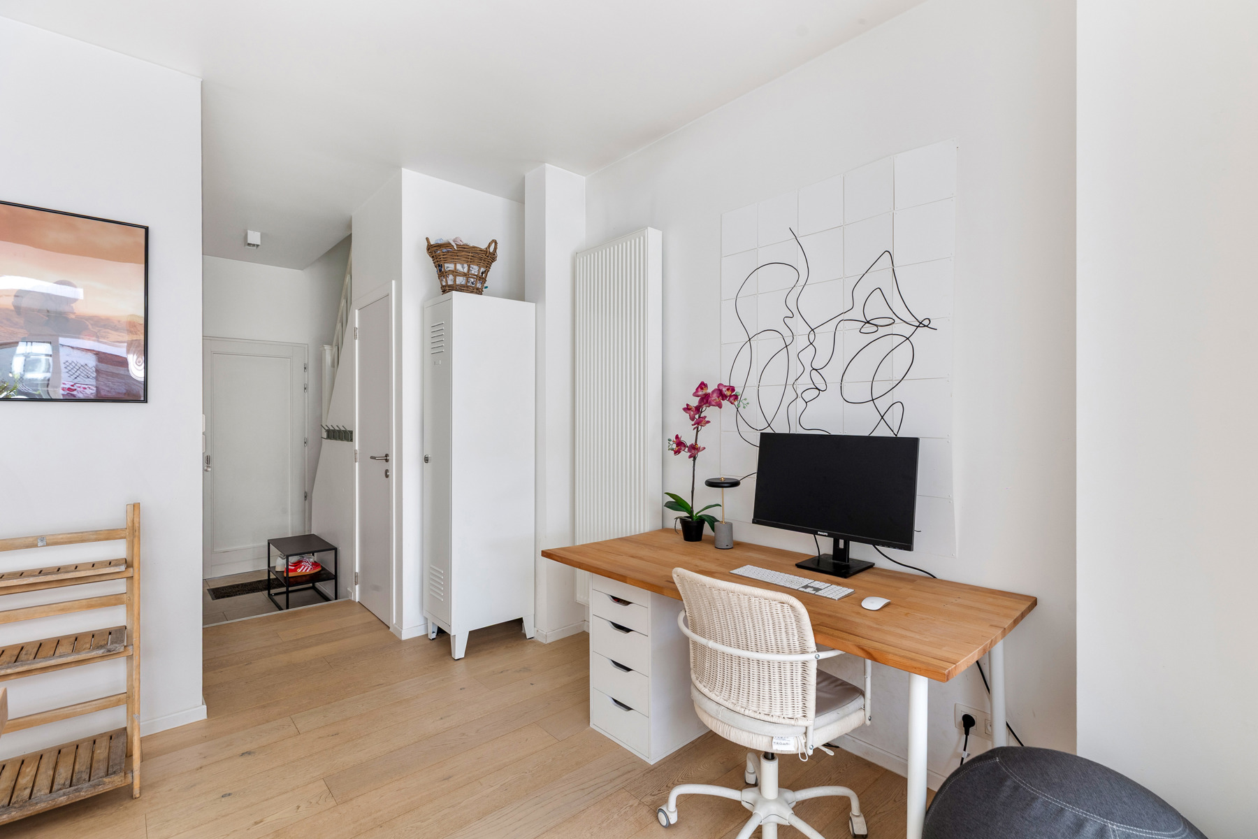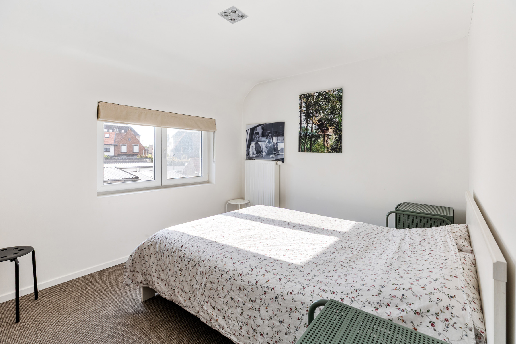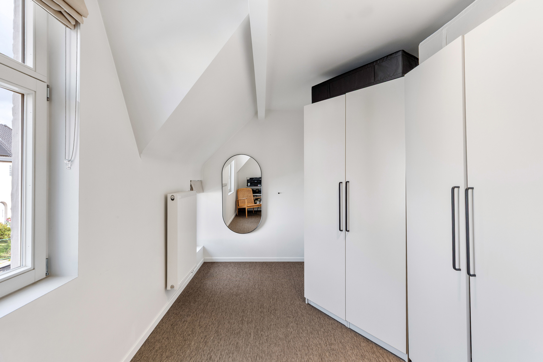 Op de eerste verdieping bevinden zich twee slaapkamers waarvan één met een volledig ingebouwde kastenwand – praktisch en stijlvol.