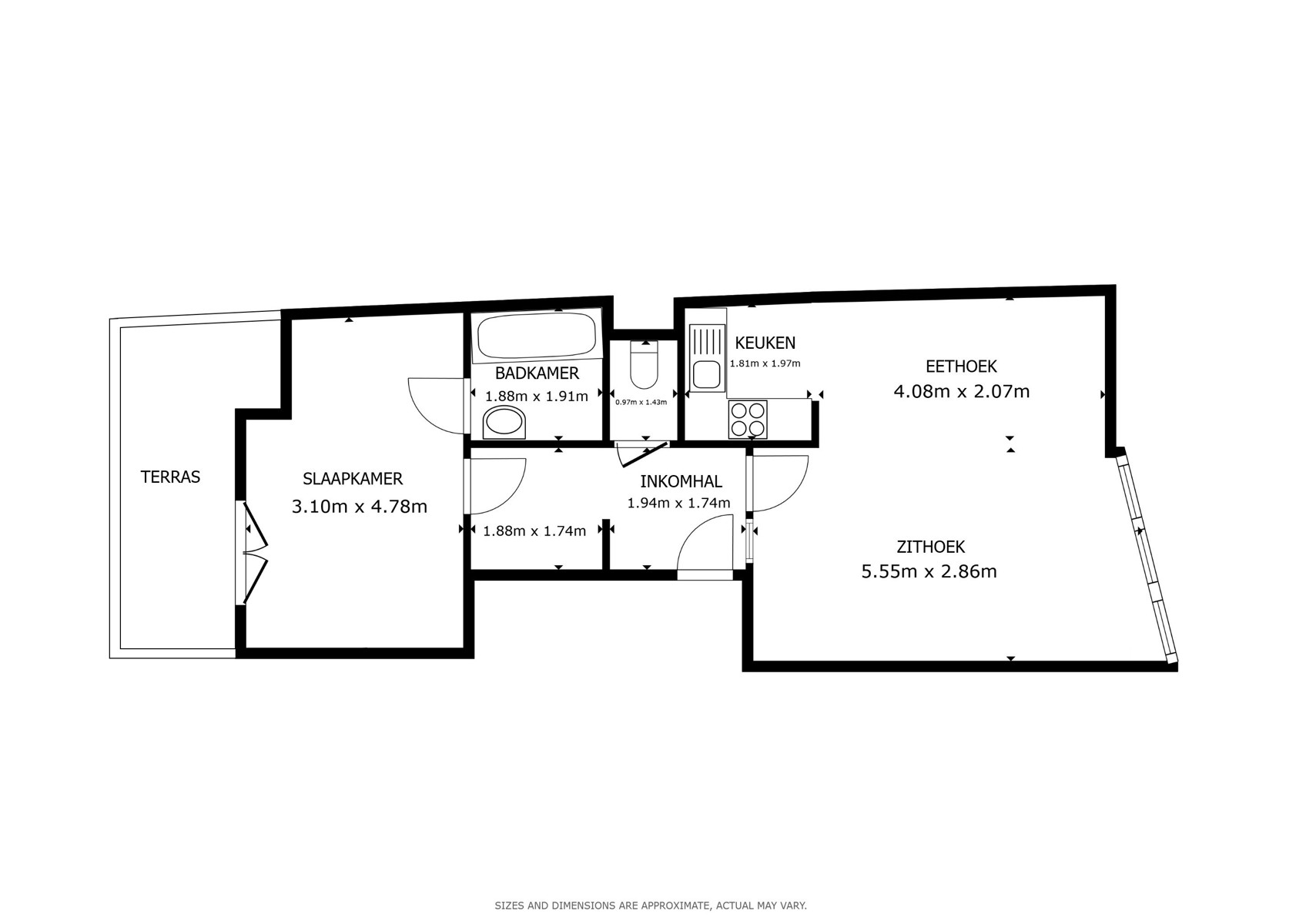 Lichtrijk appartement met 1 slaapkamer en terras.