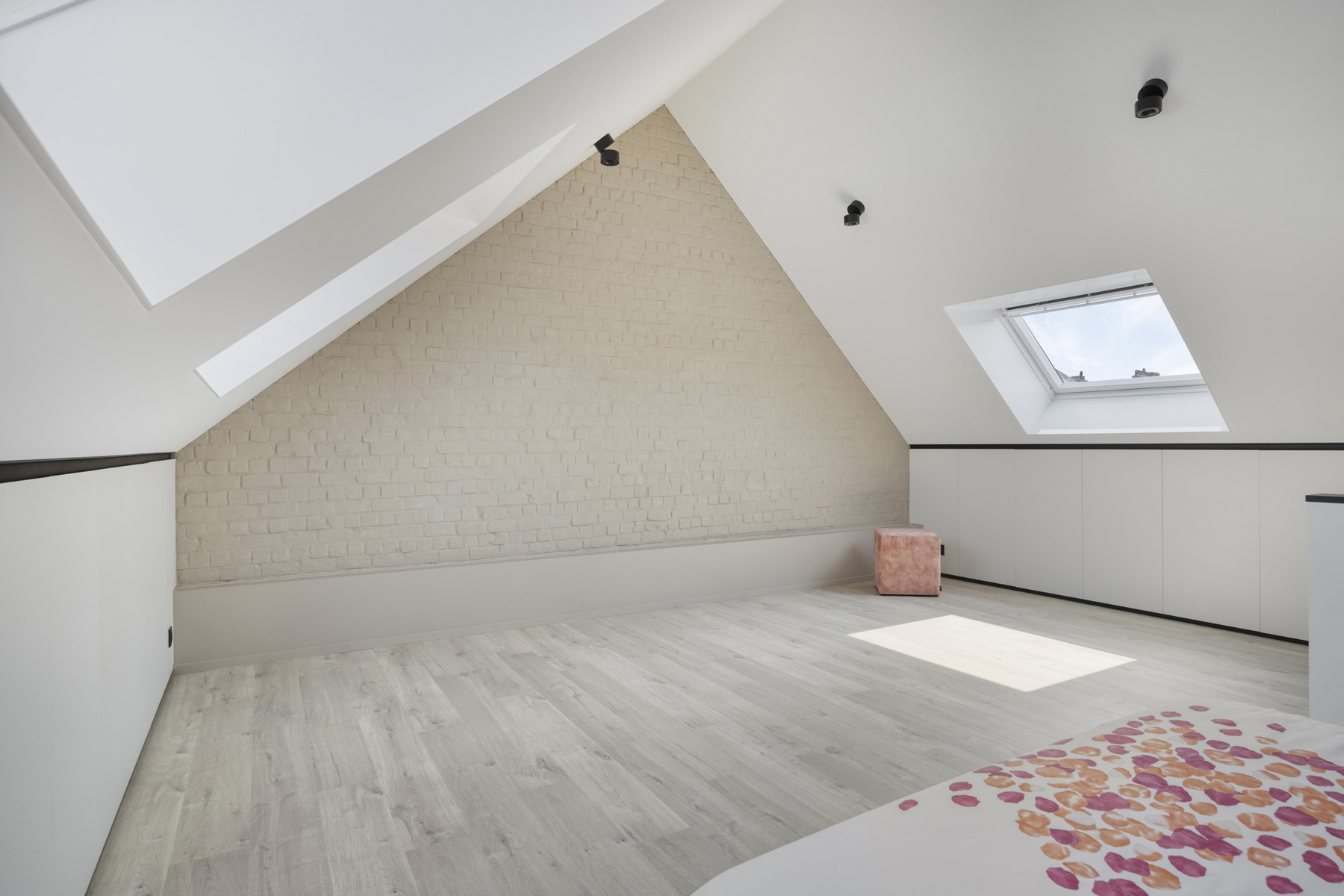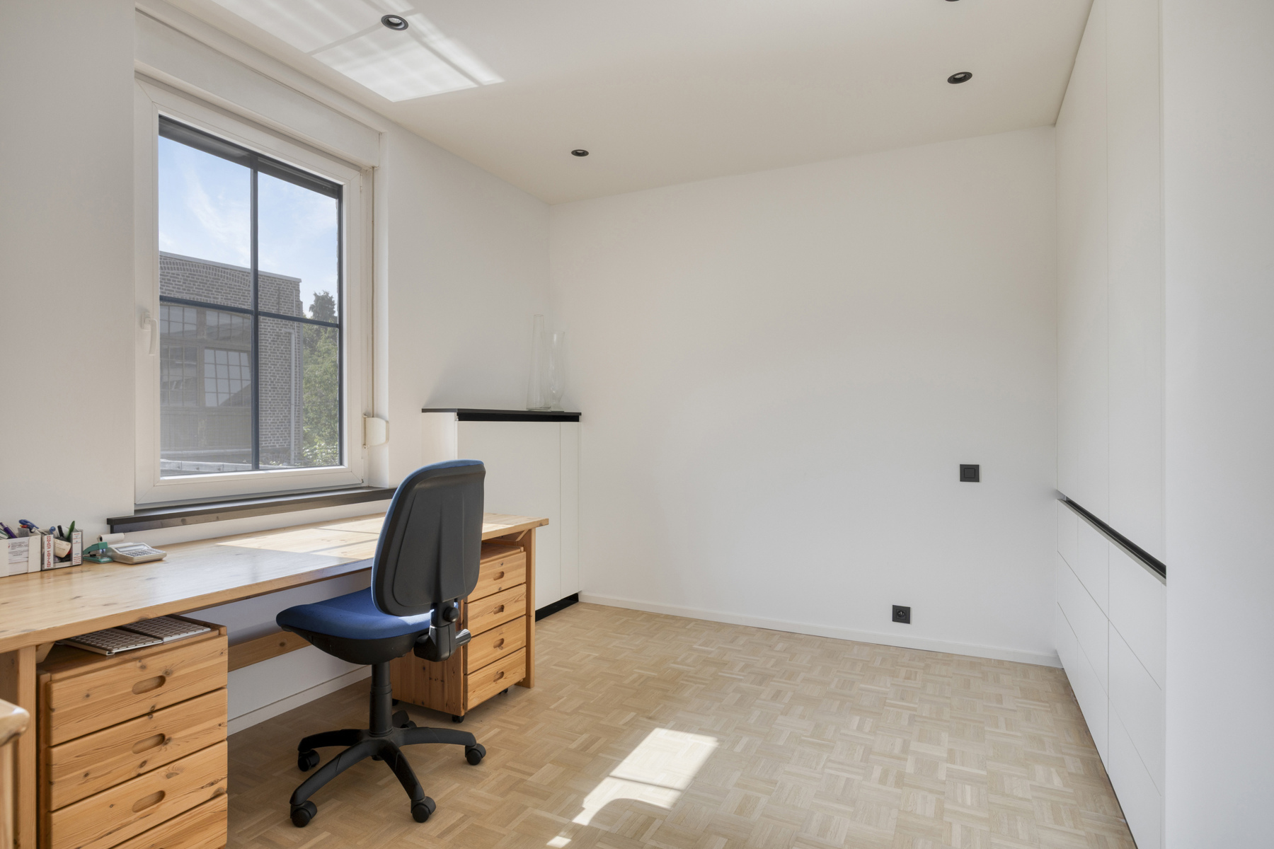 Op de eerste verdieping bevinden zich twee ruime slaapkamers en een volledig ingerichte badkamer. De afgewerkte zolderverdieping doet vandaag dienst als derde slaapkamer, maar kan ook ingericht worden als bureau of hobbyruimte. De bovenverdiepingen werden recent vernieuwd en uitgerust met maatwerk kasten, wat zorgt voor een moderne en praktische woonbeleving.