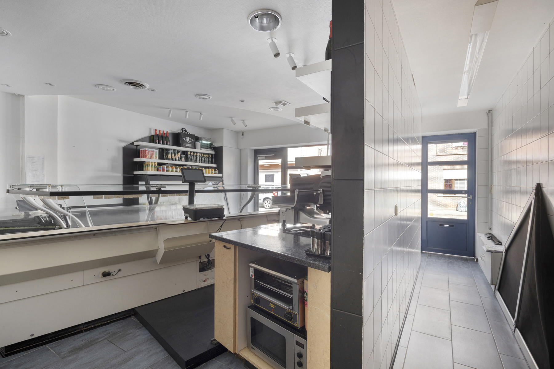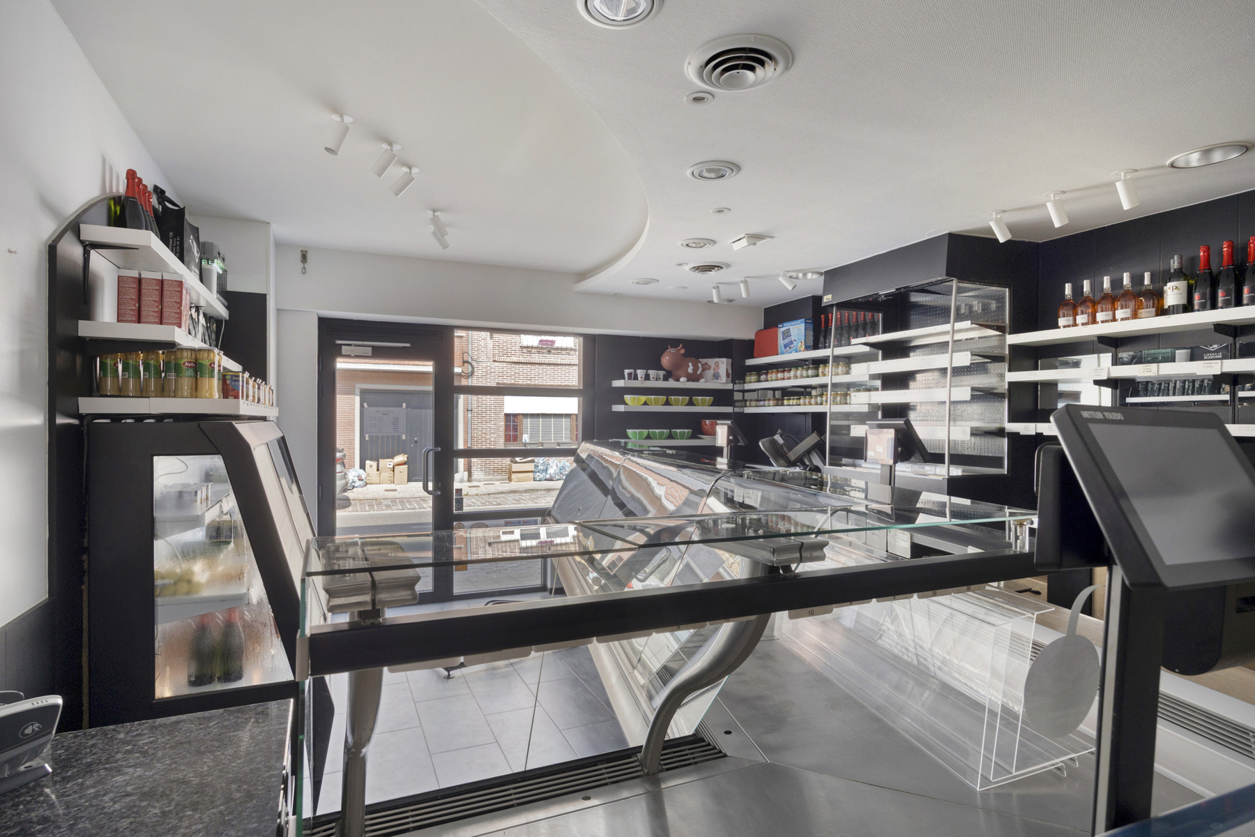 Op het gelijkvloers verwelkomt een ruime winkelruimte met aparte inkom klanten in een vertrouwde, warme sfeer. Achteraan bevinden zich een volledig ingerichte atelierruimte, handige bergingen en praktische koel- en diepvriescellen — perfect voor het uitbaten van een slagerij of een andere verszaak. Aansluitend biedt een gezellige leefruimte met keuken een huiselijke plek om te ontspannen, waarbij de indeling zorgt voor een natuurlijke scheiding tussen professioneel en privé. Extra stockage is voorzien in de kelder.