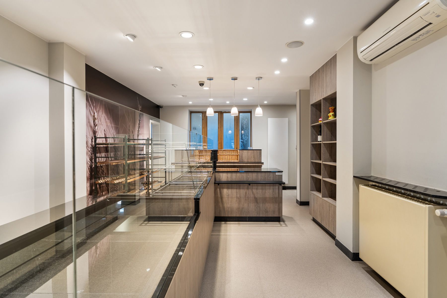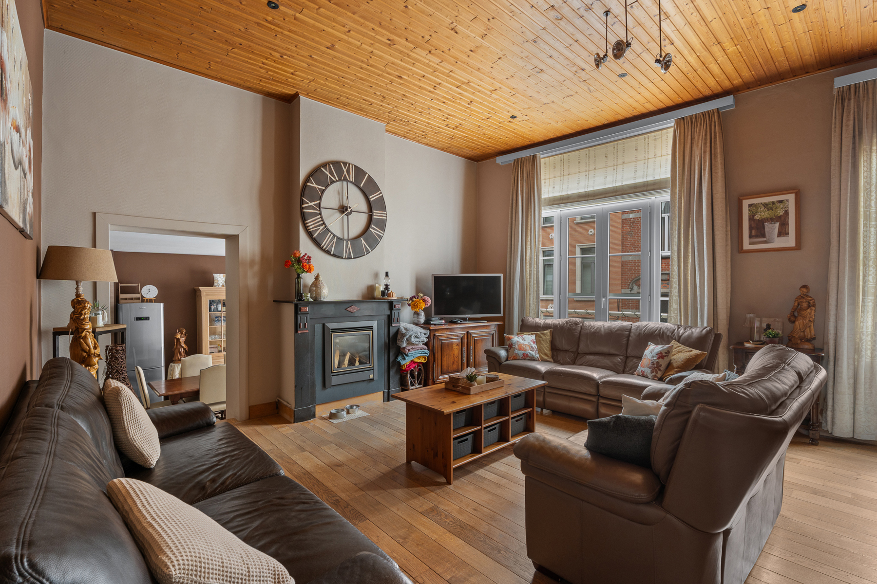 Deze eigendom combineert een warme, gezellige woonruimte met een praktische en moderne handelsruimte — ideaal voor wie wonen en werken wil combineren. De woonkamer straalt rust en comfort uit. De houten vloer en het plafond zorgen voor een natuurlijke, huiselijke sfeer. Grote ramen brengen veel daglicht binnen, waardoor de ruimte aangenaam en open aanvoelt. De zithoek met comfortabele lederen zetels vormt een ideale plek om te ontspannen, en de haard voegt extra gezelligheid toe aan het geheel. De handelsruimte is modern ingericht en praktisch ingedeeld. De combinatie van houtafwerking en zachte verlichting creëert een verzorgde en uitnodigende uitstraling. De toonbank en rekken bieden voldoende plaats voor de uitstalling van producten en een vlotte bediening van klanten. Dit pand biedt een mooie balans tussen comfortabel wonen en professioneel werken, met een aangename sfeer en een praktische indeling die tal van mogelijkheden biedt.