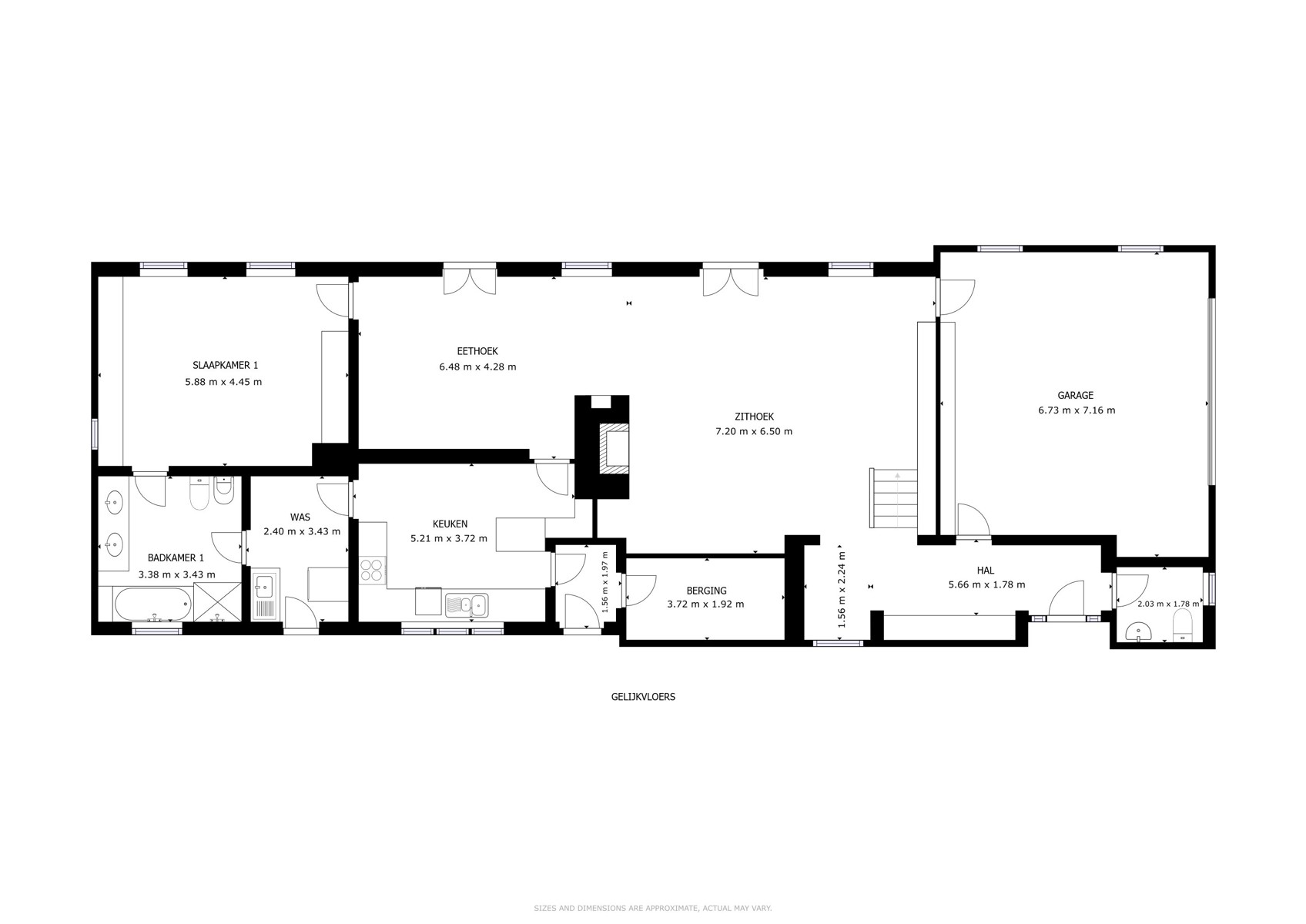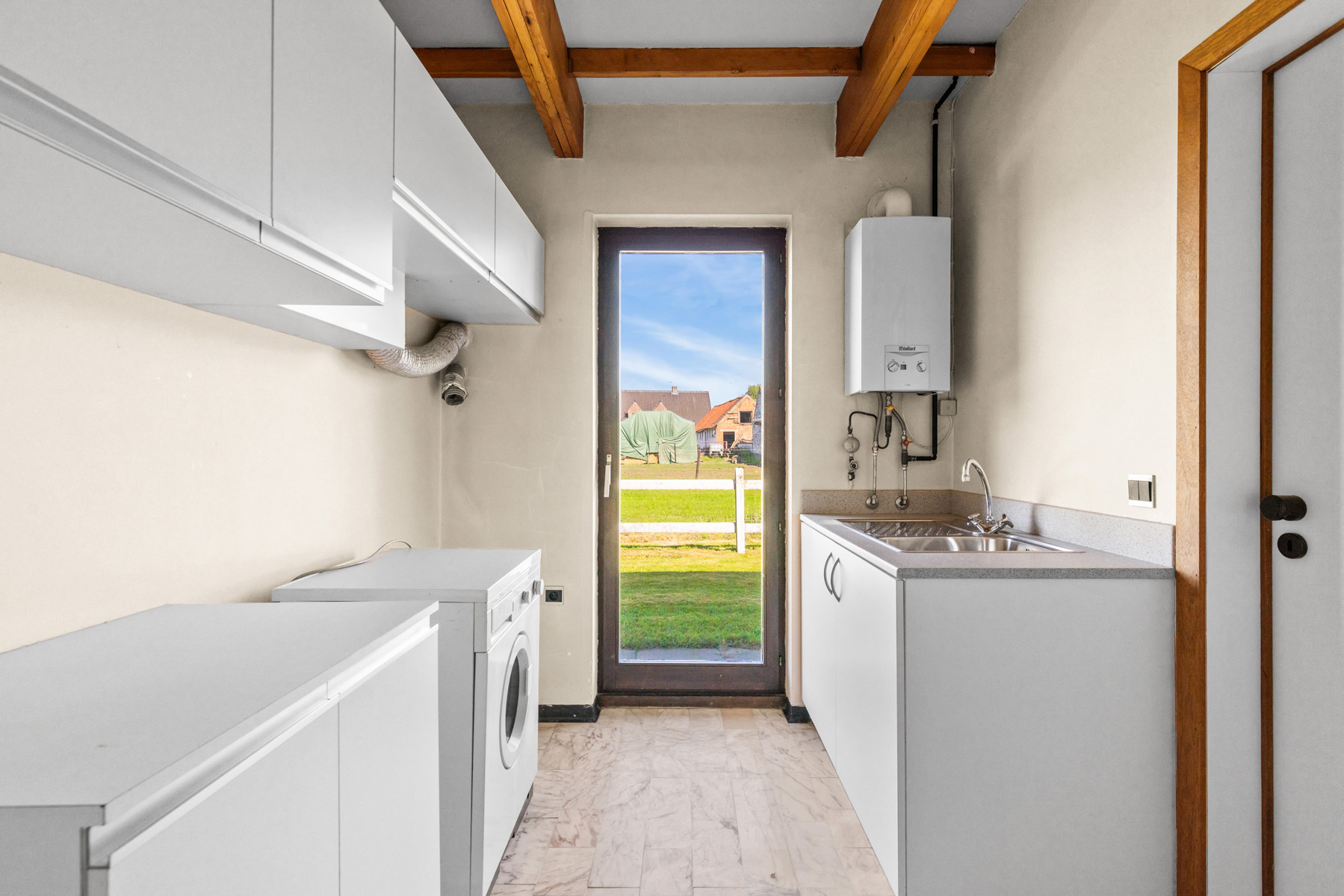 Op het gelijkvloers bevinden zich een lichtrijke inkomhal met gastentoilet, een ruime garage met nieuwe sectionaalpoort, een gezellige woon en eetruimte, aansluitend de keuken met koele inloopberging, een bijkeuken/wasplaats, een comfortabele badkamer en een eerste slaapkamer. Op de verdieping liggen een overloop, een tweede slaapkamer met ensuite douche, een multifunctionele ruimte met haard en een derde kamer of zolder met de technische installaties.