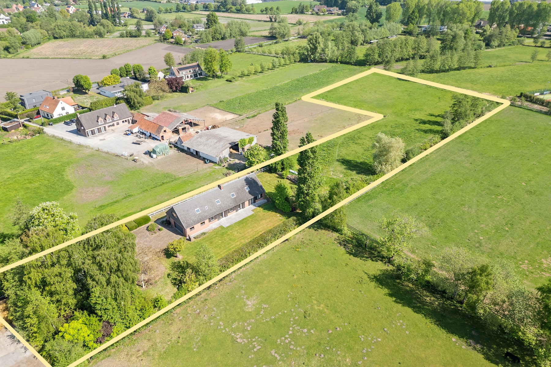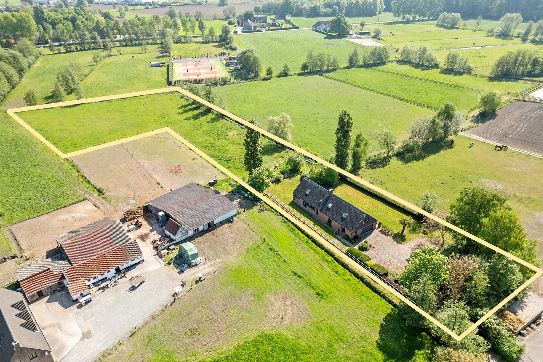 Het perceel beslaat 11.362 m², opgedeeld in drie loten, en trakteert u op vrije, groene, vergezichten—ideaal voor paardenliefhebbers of wie houdt van natuur en rust. Oprit aanwezig voor meerdere wagens. Het perceel is tevens beperkt toegankelijk (enkel bewoners) waardoor de rust gevrijwaard blijft.