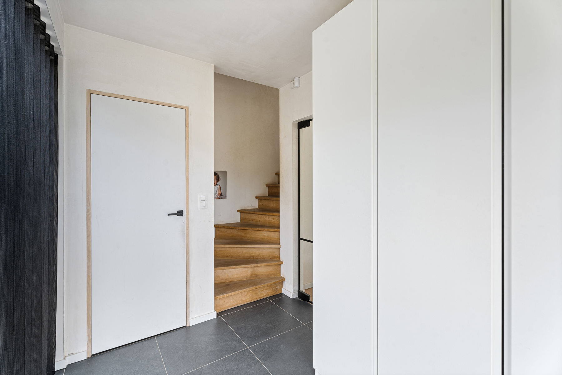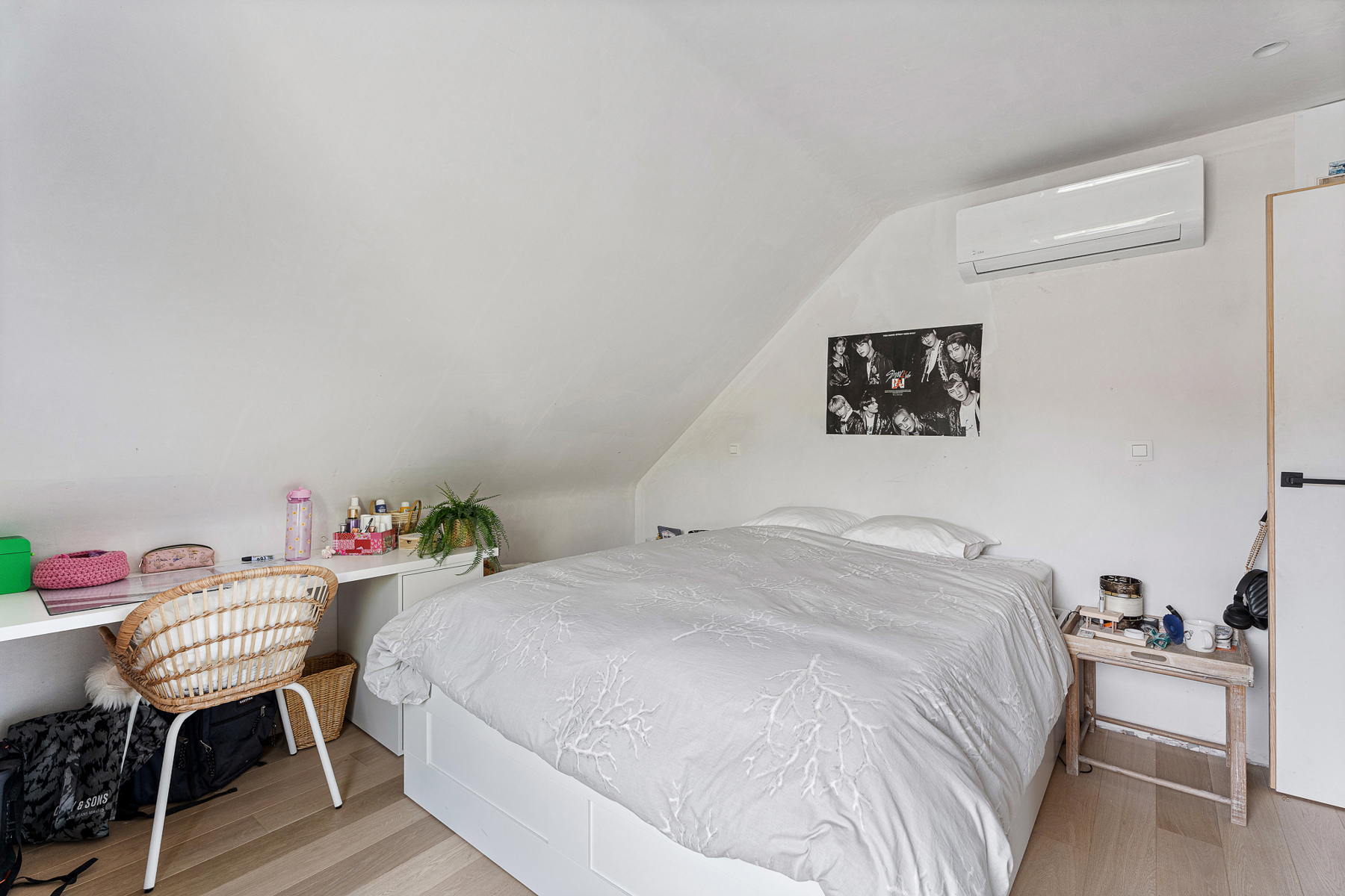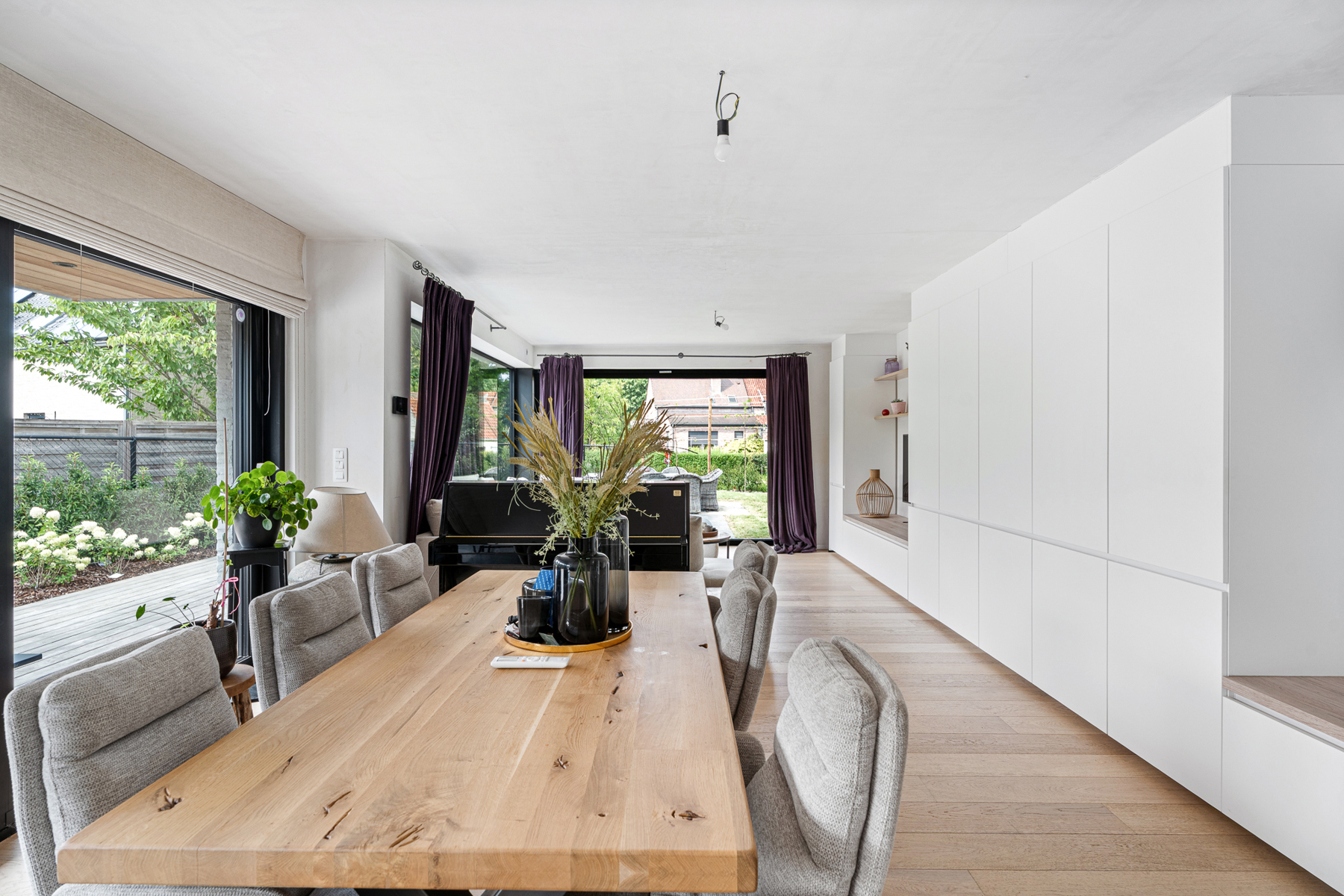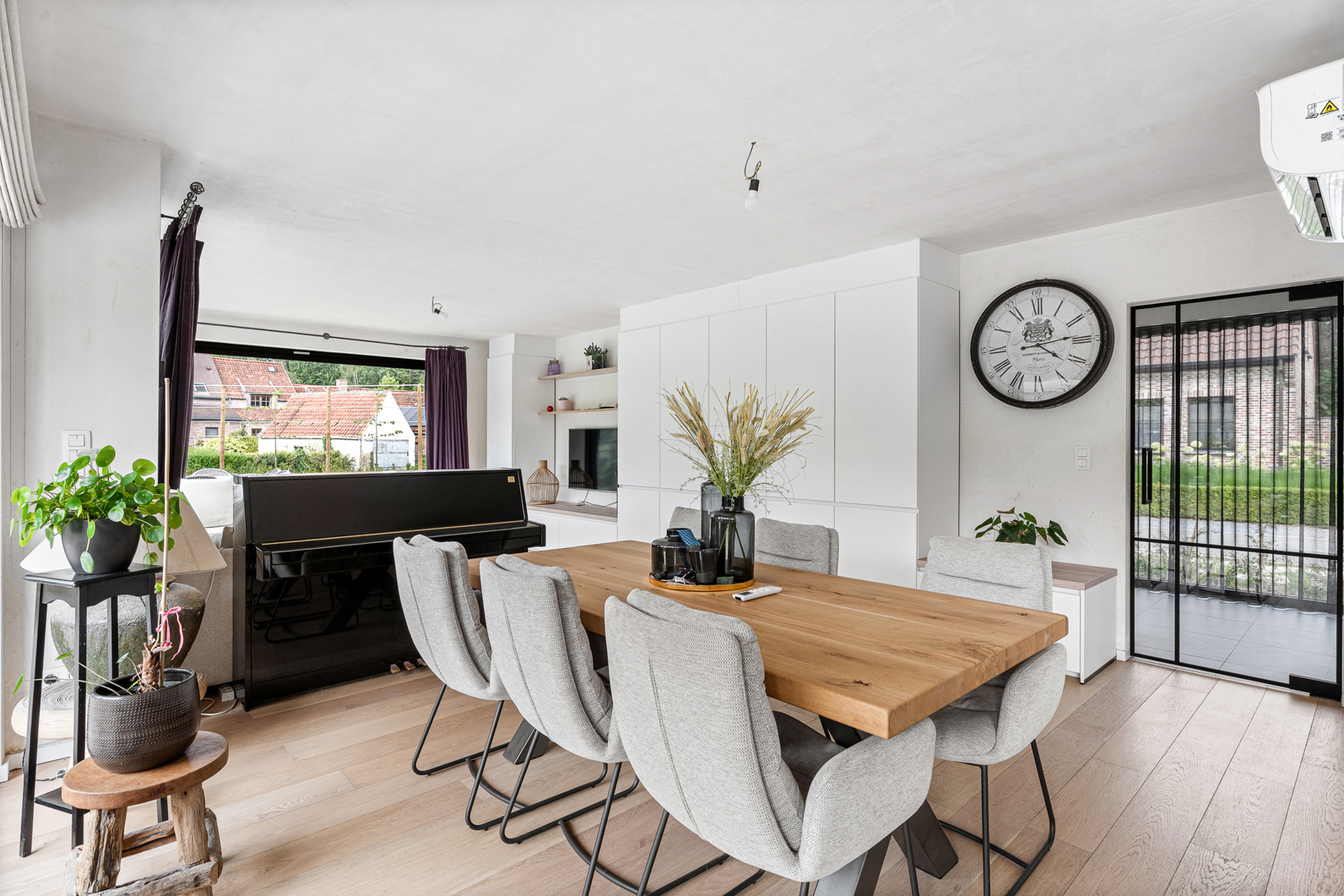 De indeling is praktisch en gaat als volgt: inkomhal met gastentoilet en trap. Via een stalen deur kom je in de woon- en eetkamer grenzend aan de open, volledig geïnstalleerde keuken voorzien van alle toestellen. De ruimte is gekenmerkt door grote raampartijen voor het ideale contact met de tuin en het terras. Een afzonderlijke was- en bergplaats grenst aan de keuken. Via die was-en bergplaats kom je in de inpandige garage welke op heden ingericht is naar de noden van de eigenaren. De 1ste verdieping heeft een overloop en vier slaapkamers, allen voorzien van airco. Een badkamer, met alle comfort, is centraal gelegen. Tot slot is er nog een opbergzolder voorzien.