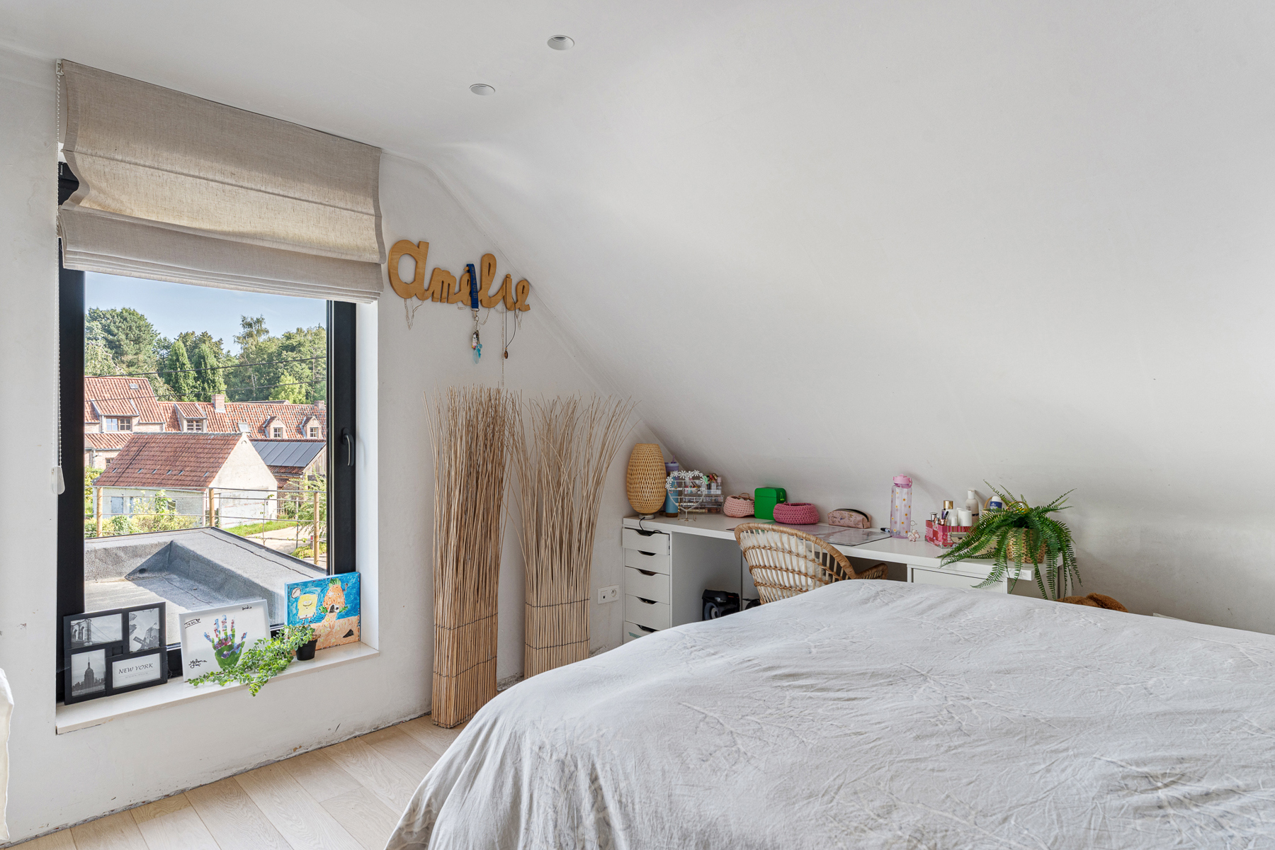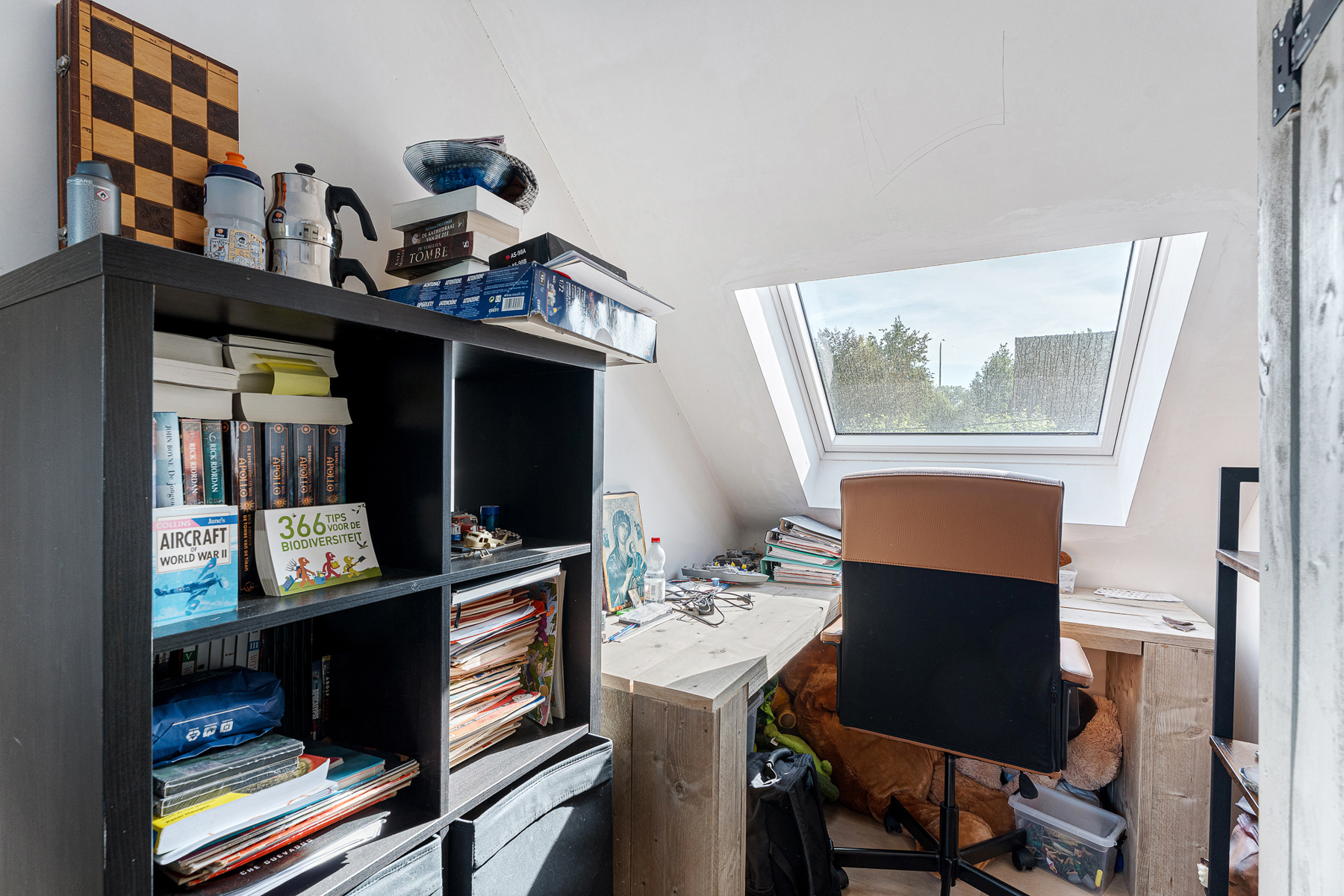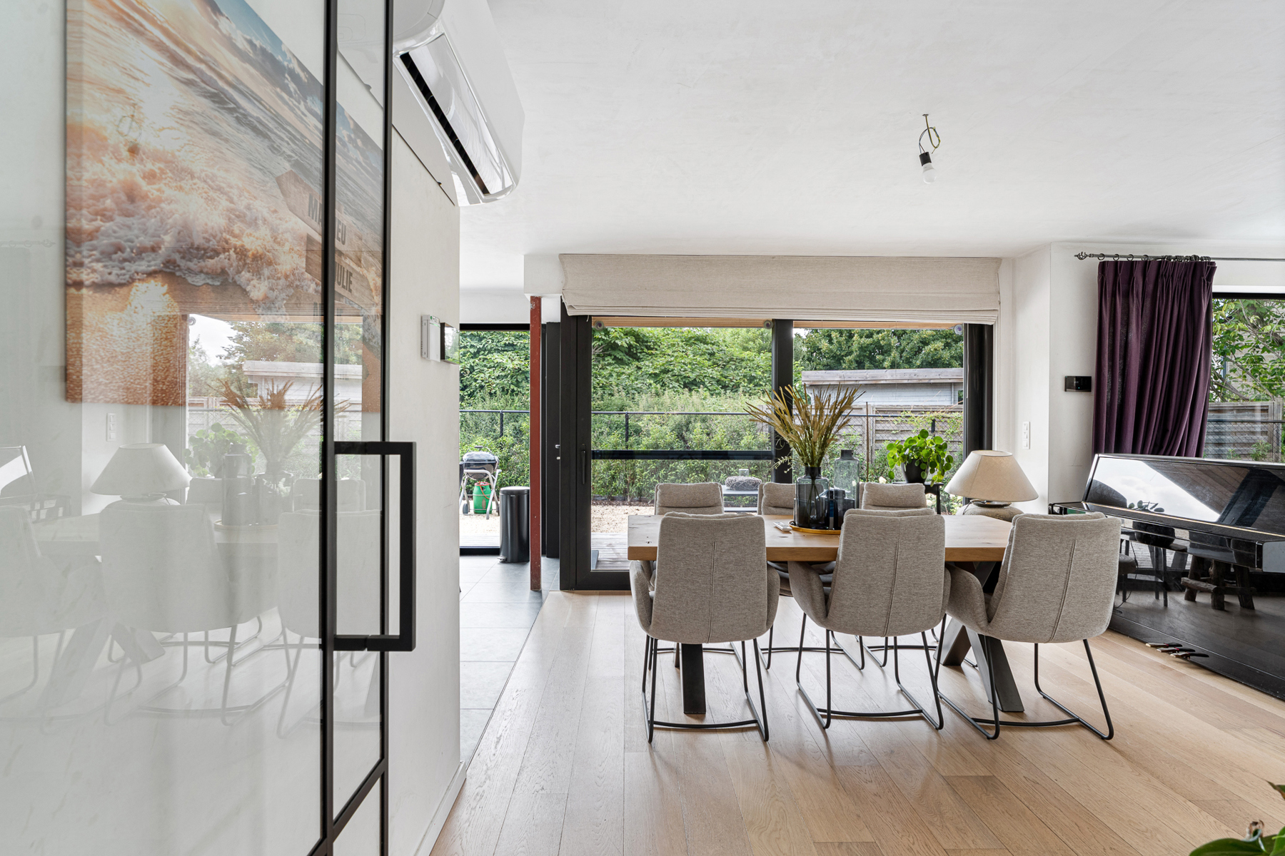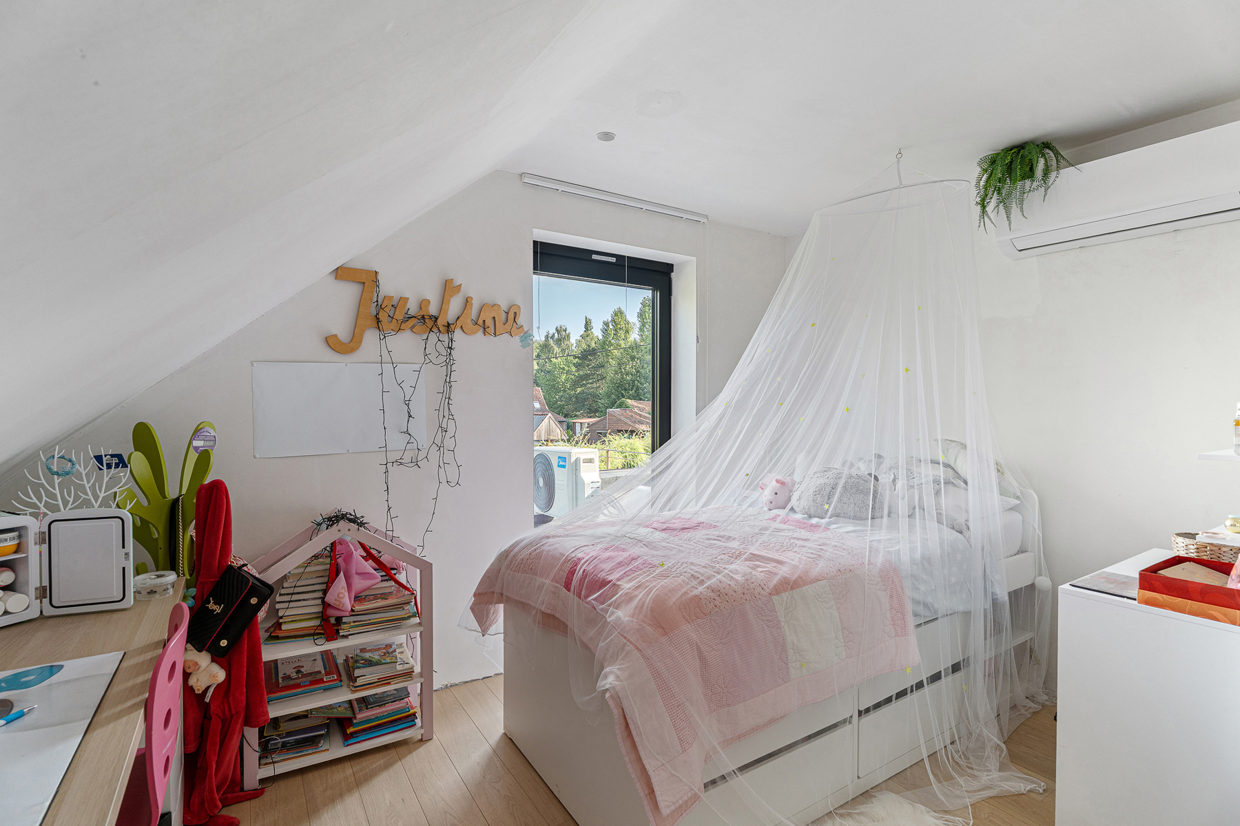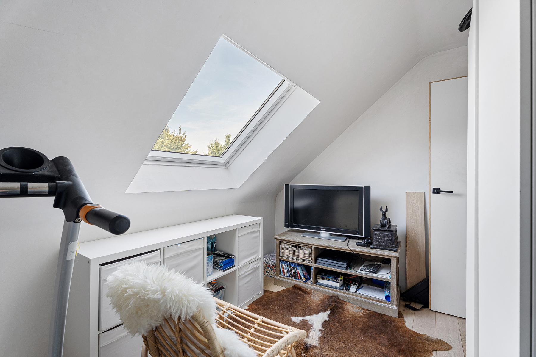 De indeling is praktisch en gaat als volgt: inkomhal met gastentoilet en trap. Via een stalen deur kom je in de woon- en eetkamer grenzend aan de open, volledig geïnstalleerde keuken voorzien van alle toestellen. De ruimte is gekenmerkt door grote raampartijen voor het ideale contact met de tuin en het terras. Een afzonderlijke was- en bergplaats grenst aan de keuken. Via die was-en bergplaats kom je in de inpandige garage welke op heden ingericht is naar de noden van de eigenaren. De 1ste verdieping heeft een overloop en vier slaapkamers, allen voorzien van airco. Een badkamer, met alle comfort, is centraal gelegen. Tot slot is er nog een opbergzolder voorzien.