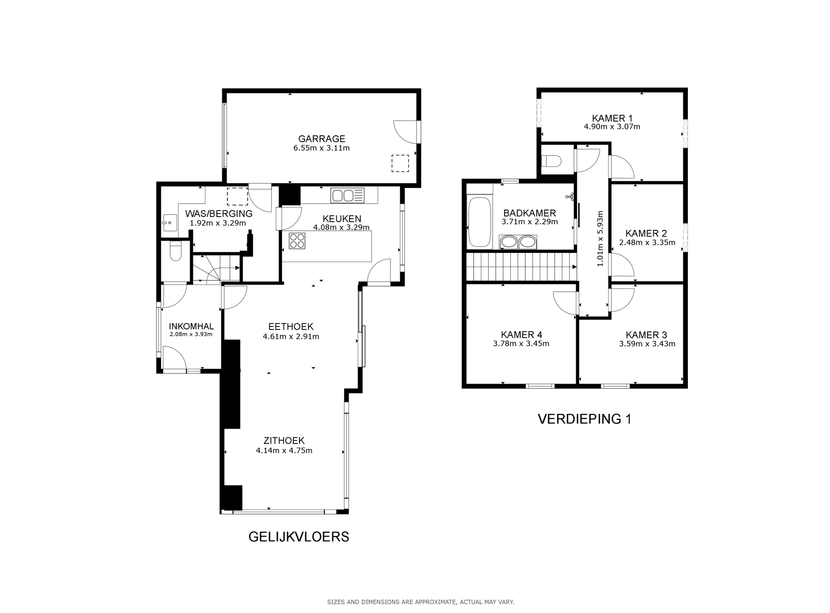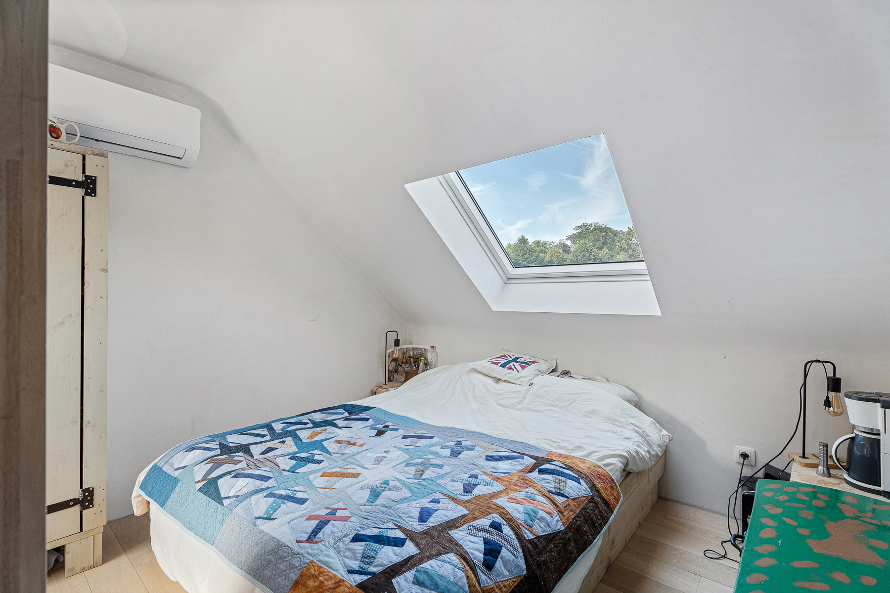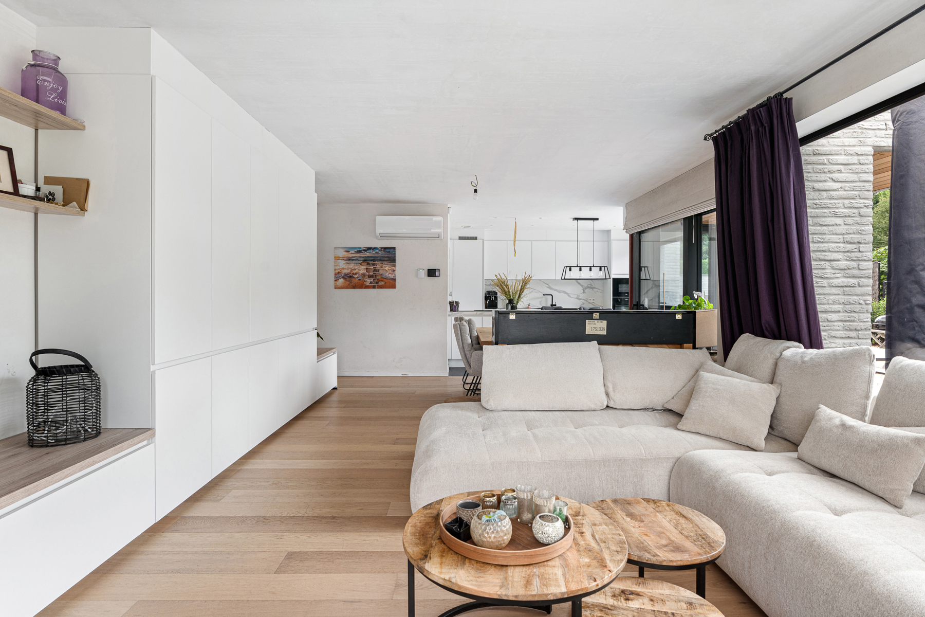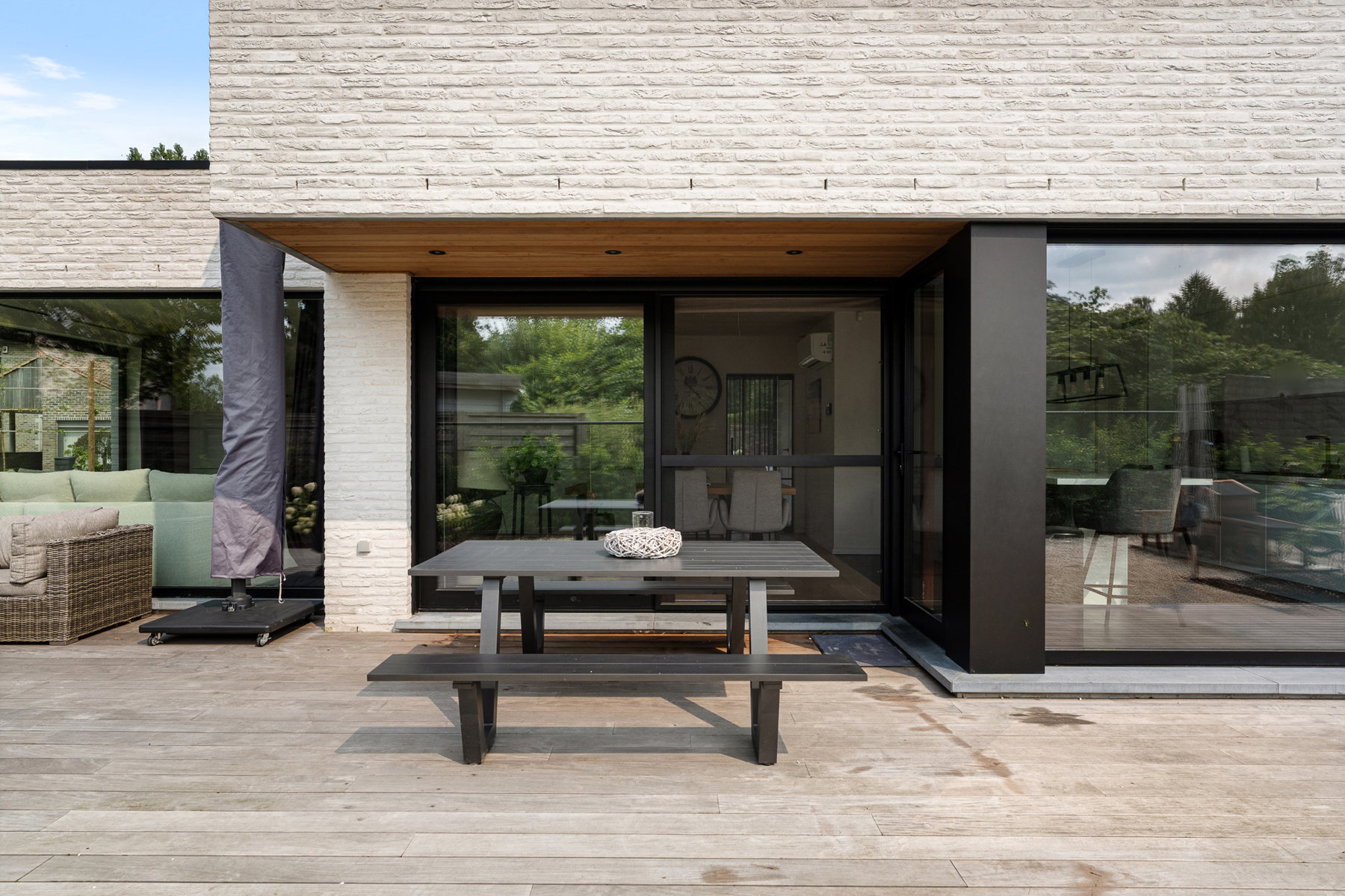 De indeling is praktisch en gaat als volgt: inkomhal met gastentoilet en trap. Via een stalen deur kom je in de woon- en eetkamer grenzend aan de open, volledig geïnstalleerde keuken voorzien van alle toestellen. De ruimte is gekenmerkt door grote raampartijen voor het ideale contact met de tuin en het terras. Een afzonderlijke was- en bergplaats grenst aan de keuken. Via die was-en bergplaats kom je in de inpandige garage welke op heden ingericht is naar de noden van de eigenaren. De 1ste verdieping heeft een overloop en vier slaapkamers, allen voorzien van airco. Een badkamer, met alle comfort, is centraal gelegen. Tot slot is er nog een opbergzolder voorzien.