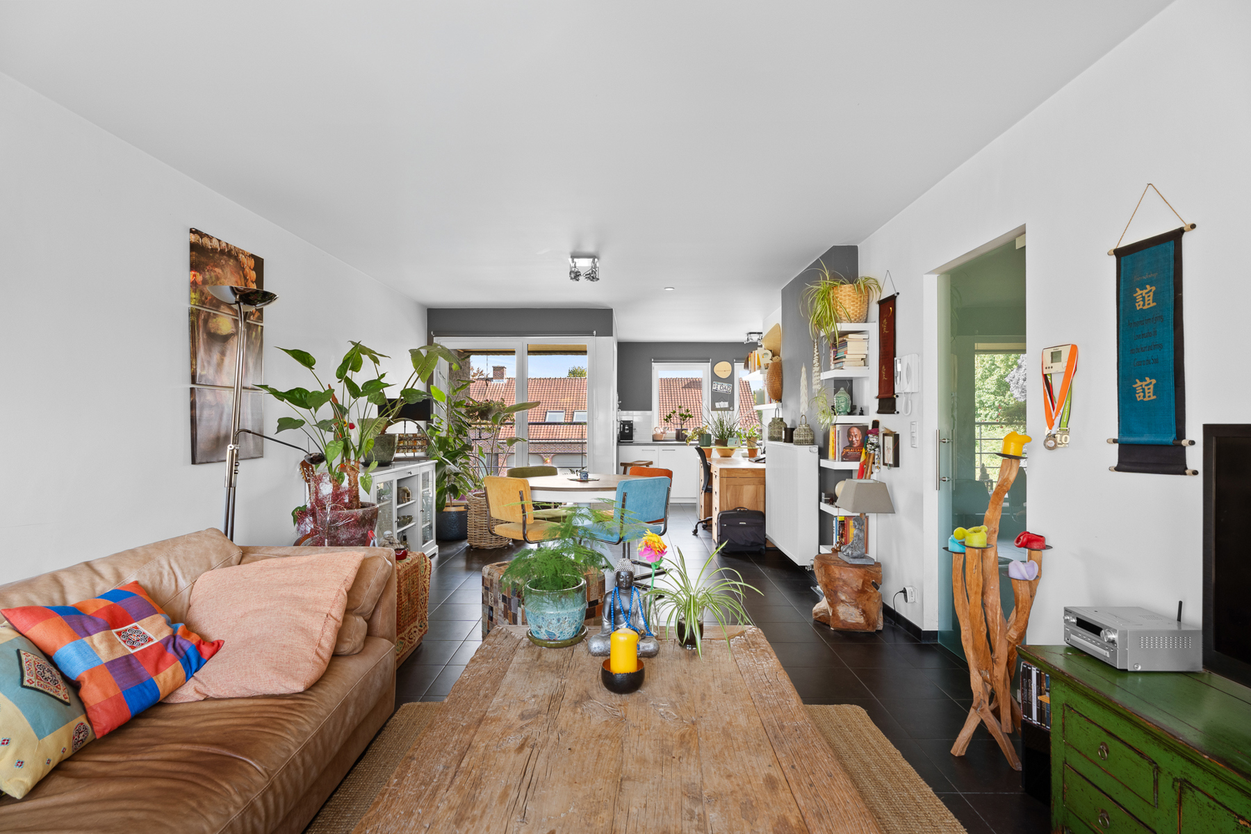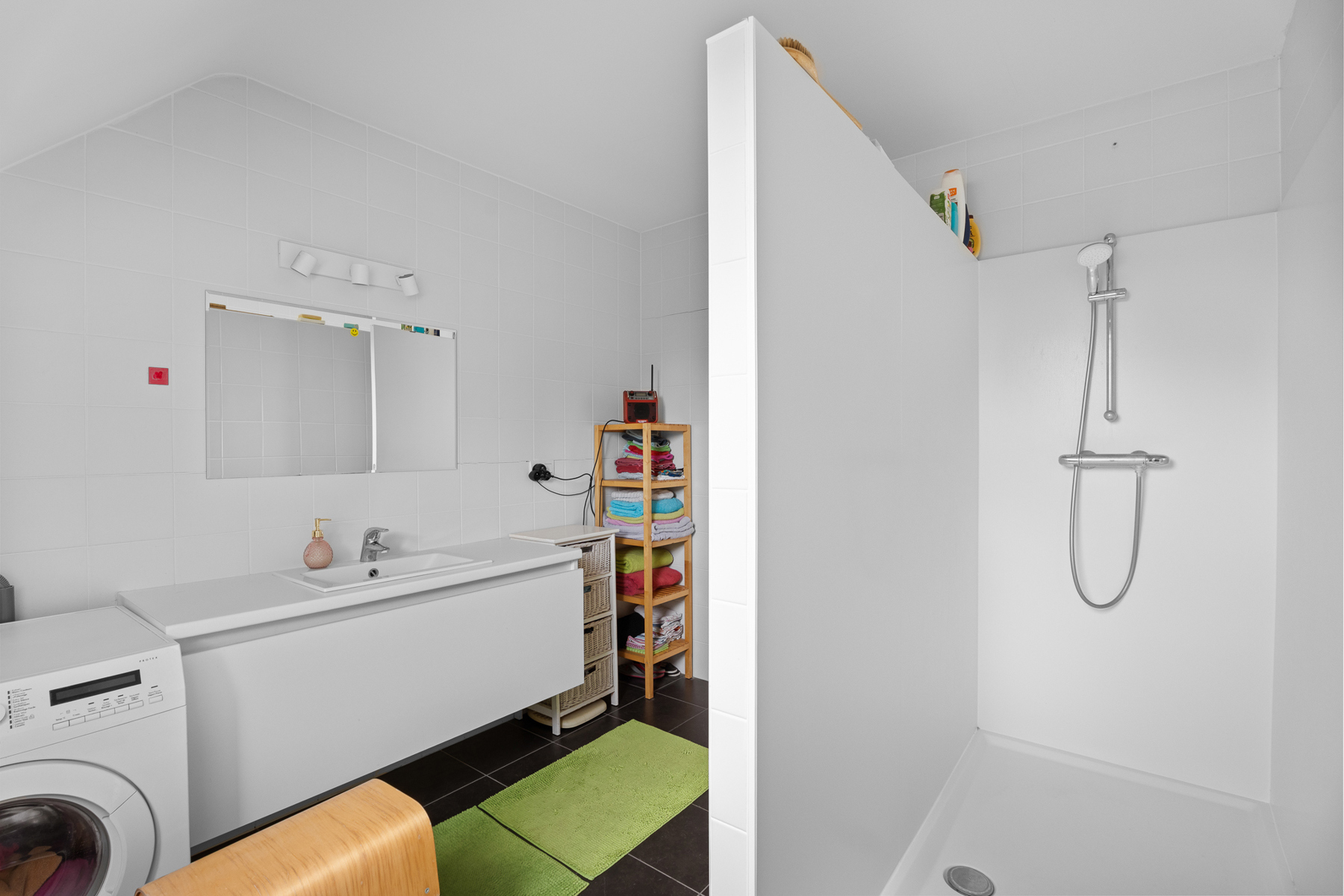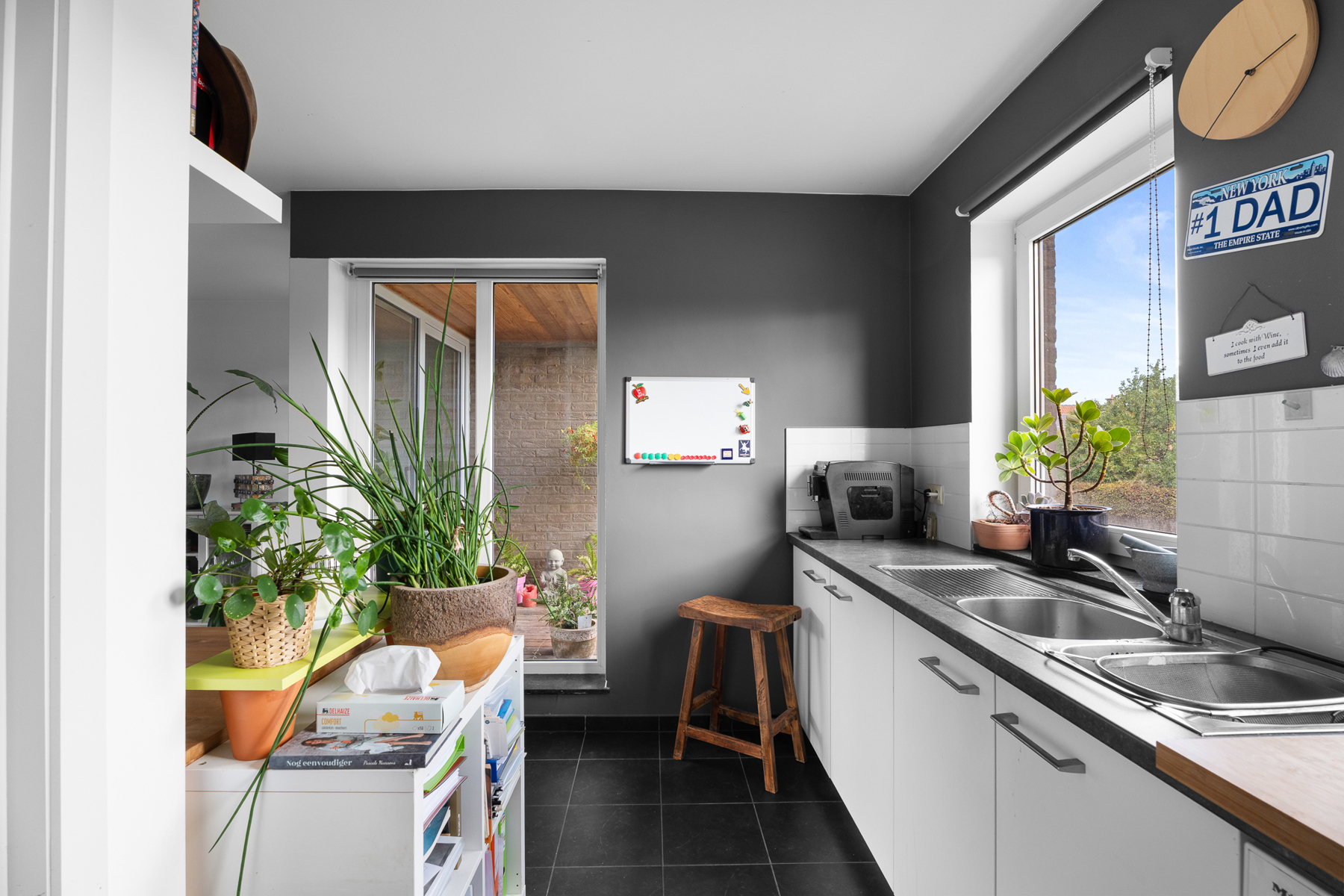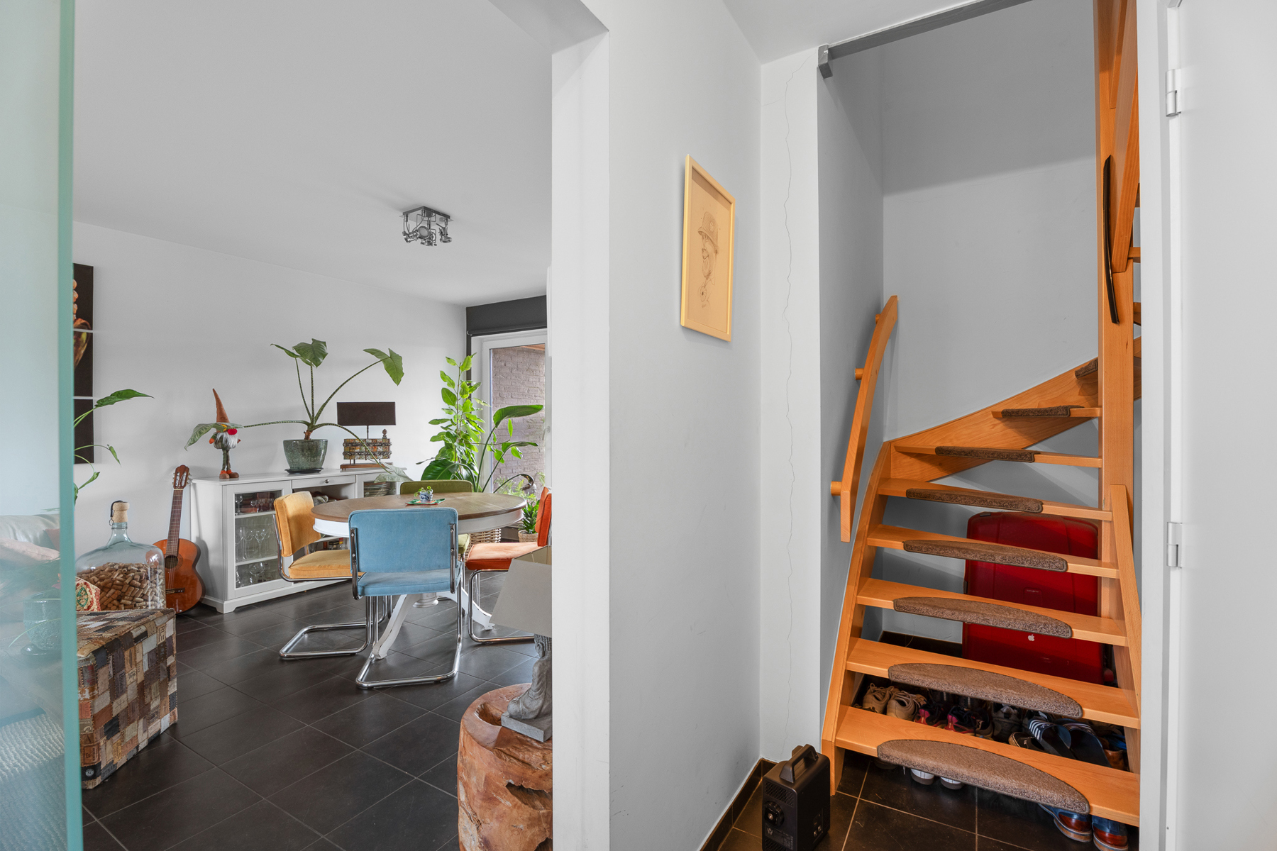 Doorheen het appartement werd gebruik gemaakt van kwalitatieve en onderhoudsvriendelijke materialen. Alles werkt afgewerkt met oog voor detail en alle hedendaagse voorzieningen zijn aanwezig. Indeling: inkomhal met trap en gastentoilet, een open, volledig geïnstalleerde, keuken (grenzend aan een berging) met zicht op de eet- en woonkamer en met toegang tot het ruime, zonnige, terras. Via het terras is er toegang tot een opbergruimte met de technische installaties. Via de trap in de inkomhal kom je op de overloop met toegang tot twee slaapkamers en de badkamer met alle comfort. Tot slot is er op het perceel nog een afsluitbare, afzonderlijke, garage aanwezig!
