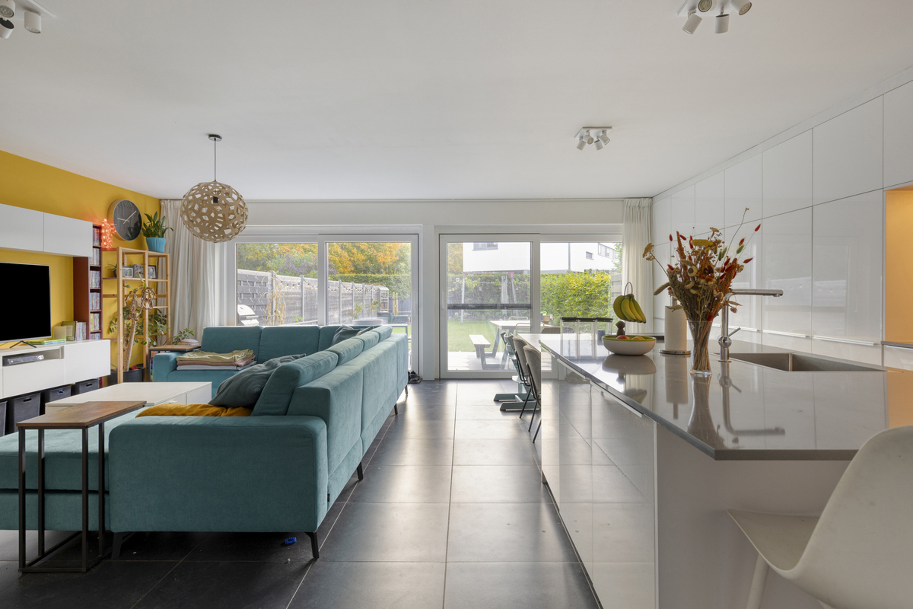 Lichte, open woonkamer met keuken (57 m²) met ruimte voor een speelhoek of leeshoek