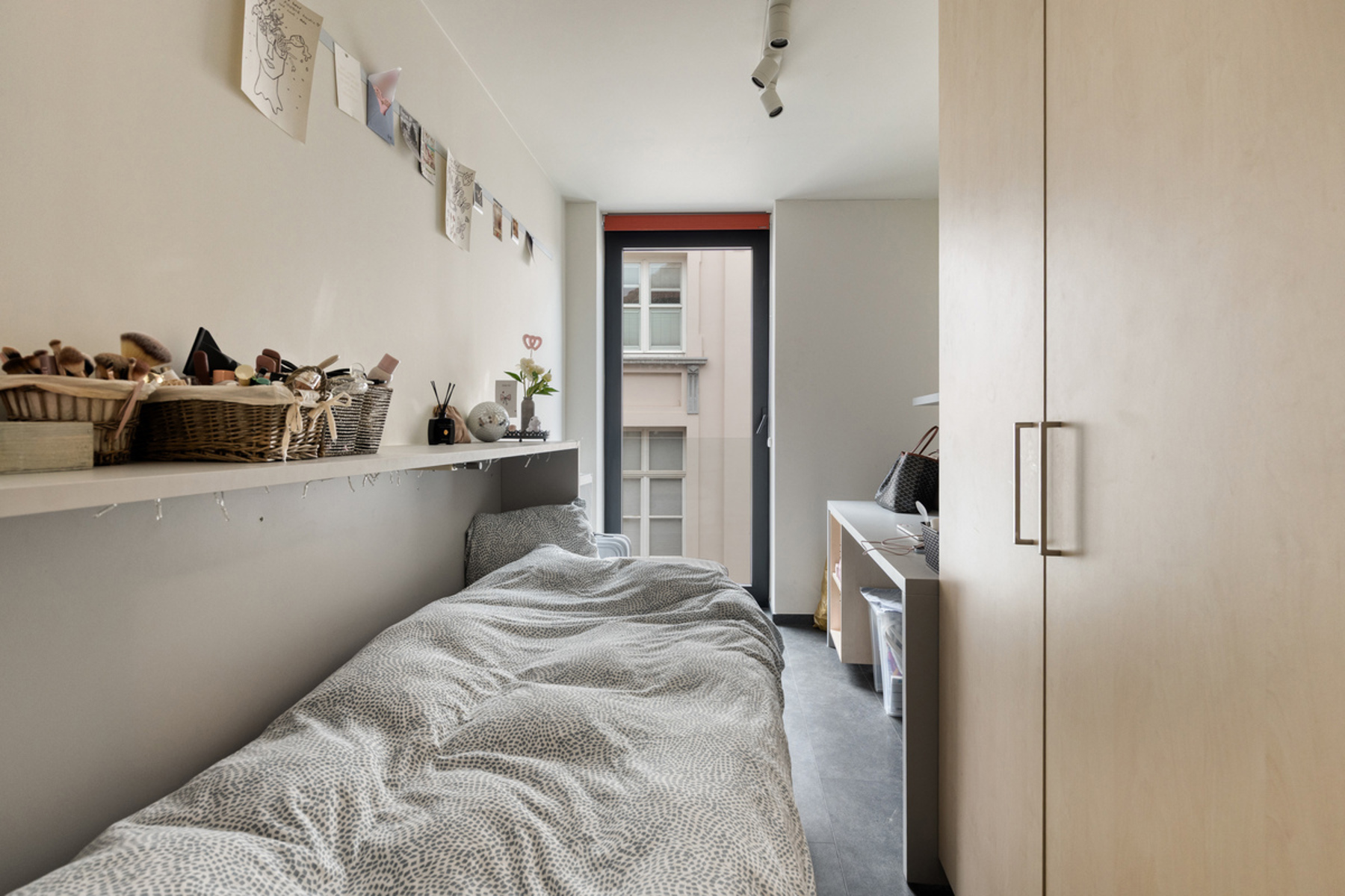 Via een aparte ingang bereikt u de studentenresidentie, los van het handelspand voor optimale privacy. De indeling omvat 5 smaakvol ingerichte kamers met gedeelde leefkeuken en tv-ruimte, aangevuld met 2 volwaardige studio’s. Alle units zijn uitgerust met kwalitatief vast meubilair en voldoen aan het Thomas More-label, een extra garantie op vlotte verhuring.