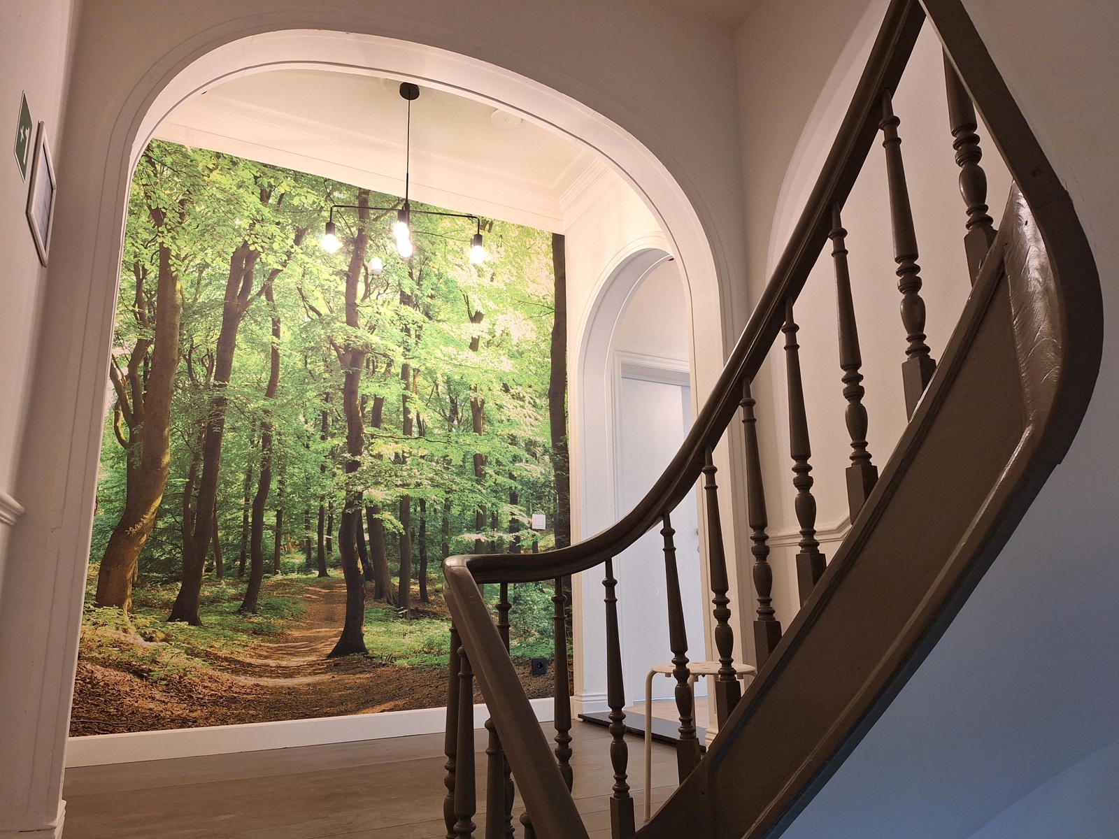 Op het gelijkvloers is er een gemeenschappelijke leefkeuken met fantastische uitzicht op het tuinterras. Gelijkvloerse studio met naastliggend de fietsenberging. Op het tussenverdiep vinden we een leeshoek terug waar je je kan afzonderen in alle rust. Op verdiep 1 - 2 en 3 zijn er steeds 2 studios voorzien , allen voorzien van douche, wc en lavabo.
