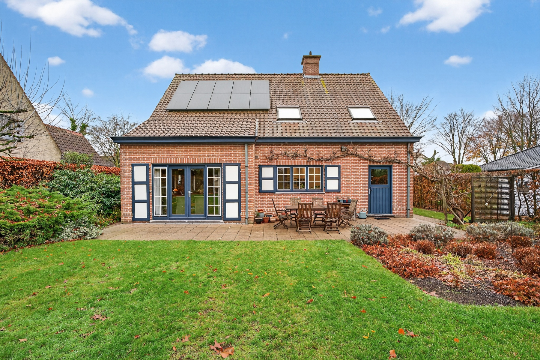 De tuin is onderhoudsvriendelijk aangelegd en nodigt uit om elk seizoen intens te beleven. Zonnepanelen dragen bij aan een energiezuinige en toekomstgerichte woonervaring.