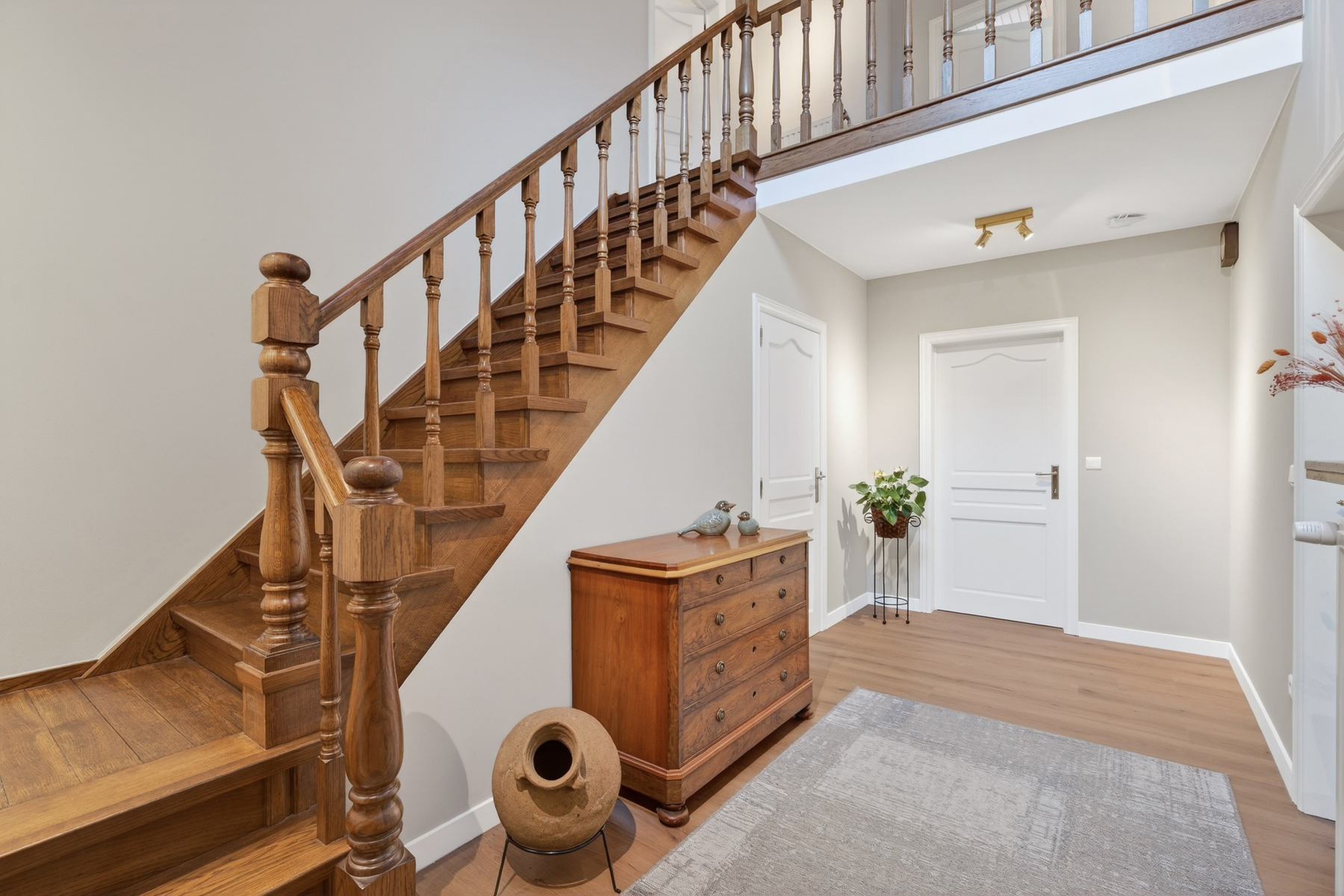 Via de open trappenhal met gastentoilet bereikt u de eerste verdieping, waar drie volwaardige slaapkamers, een comfortabele badkamer en een extra berging zorgen voor een bijzonder aangenaam wooncomfort. Bovendien is er bijkomende bergruimte op zolder.