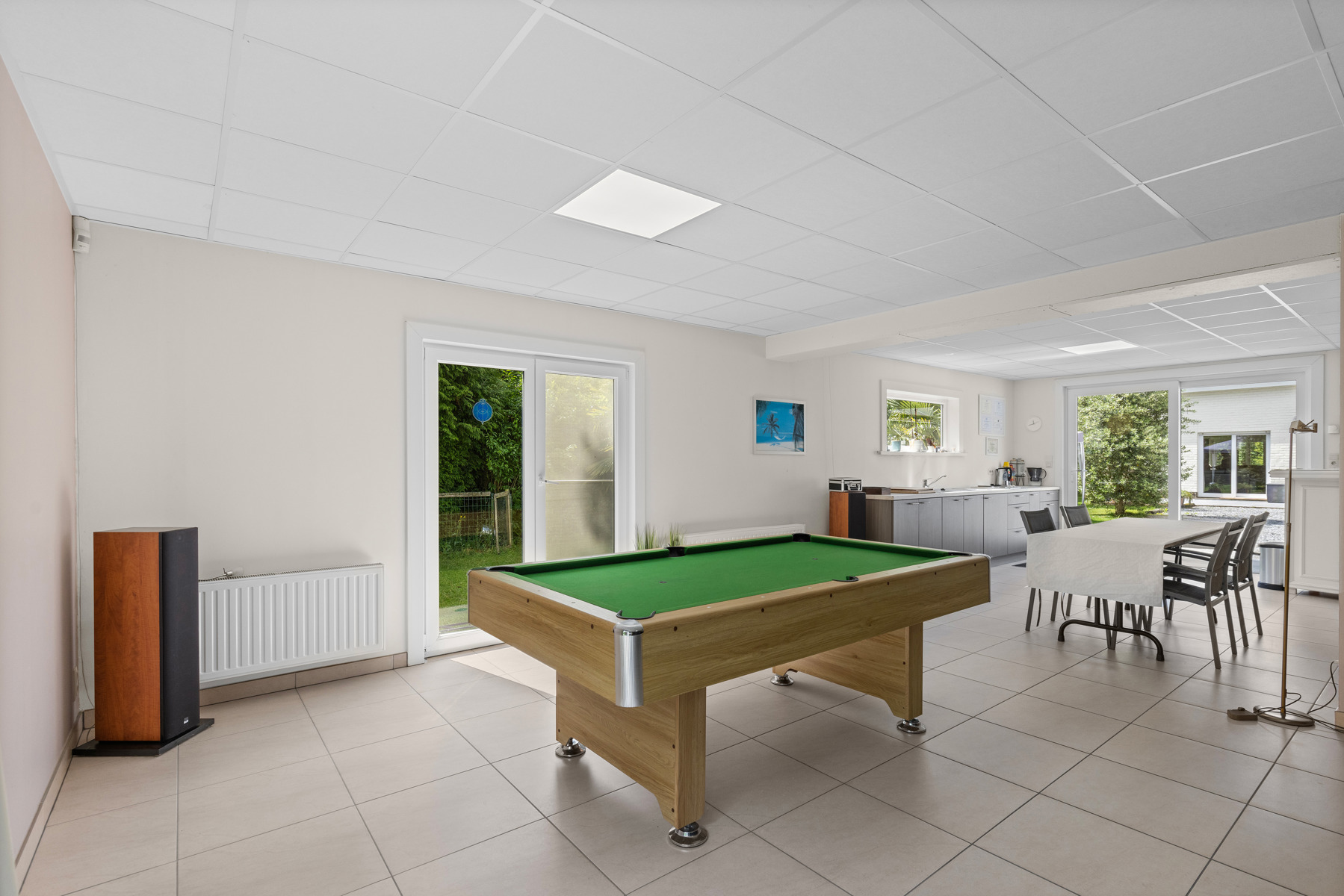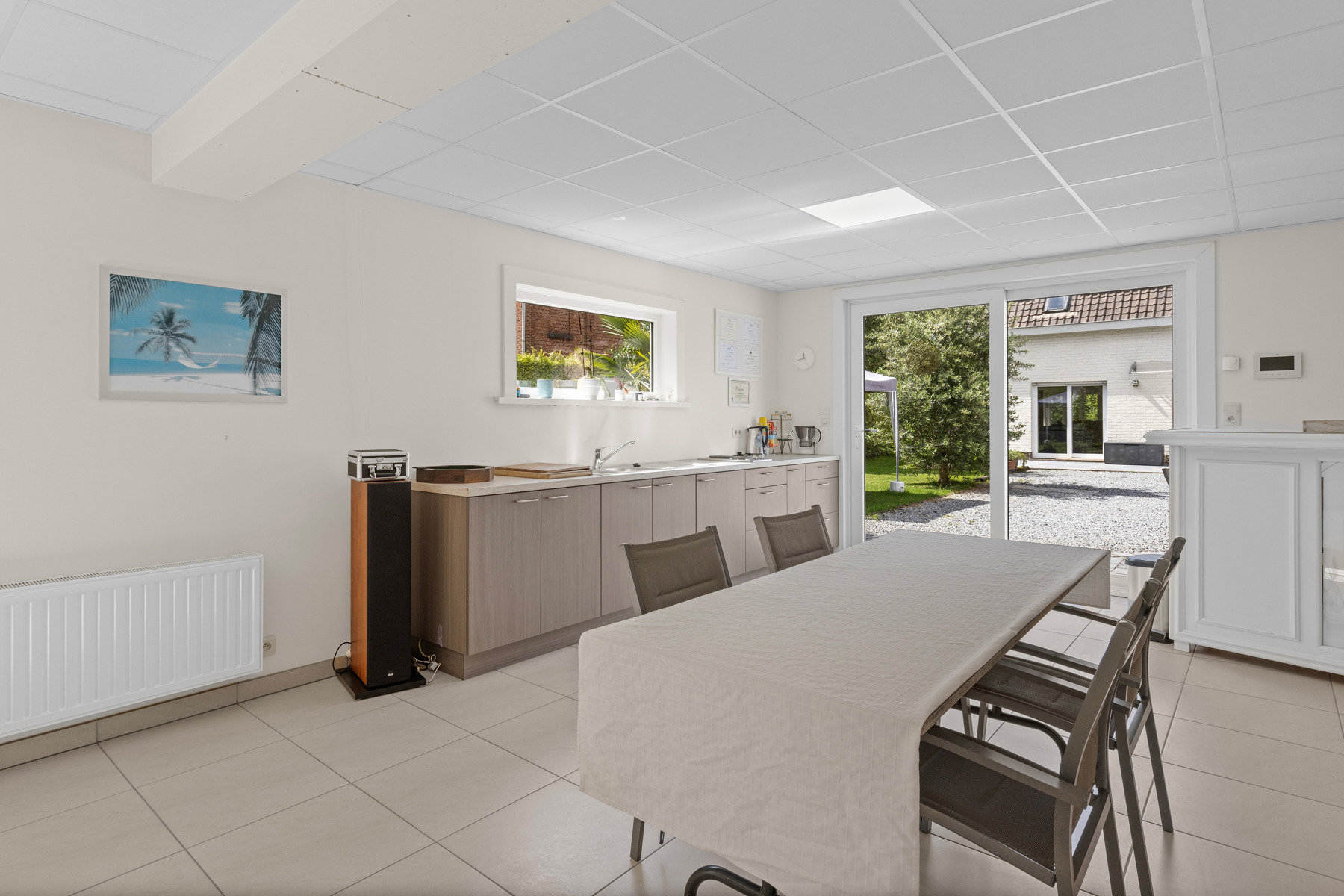 De woning zelf ondersteunt dit verhaal: aan de voordeur bevindt zich een royale bureauruimte, ideaal als extra werkplek of vierde slaapkamer, met daarnaast een gastentoilet voor bezoekers. Verderop ontvouwt zich de leefruimte met open keuken, eetplaats en zithoek die samen een aangename woon flow vormen. Aansluitend zijn er een praktische kelder, berging en wasplaats die slim geïntegreerd zijn tussen keuken en bijgebouw.