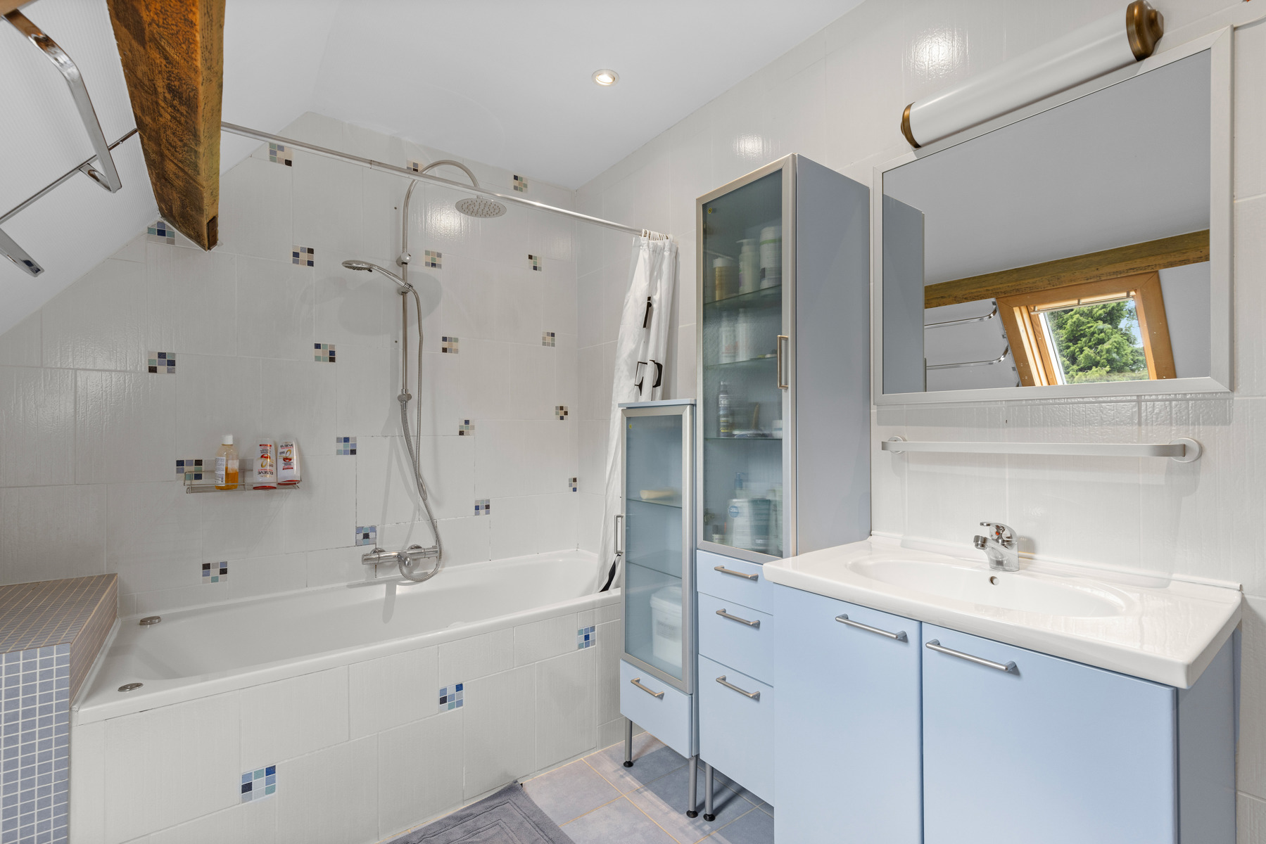 Boven bevinden zich drie ruime slaapkamers en een verzorgde badkamer, met een extra bergruimte die eenvoudig kan worden omgevormd tot uitbreiding van het sanitair. De zolder biedt bijkomende opslag of het potentieel tot extra woonruimte. De woning, oorspronkelijk gebouwd in 1962 en grondig gerenoveerd in 2011, is uitgerust met gevulde spouwmuren, 20 zonnepanelen, een regenwaterput van 5.000 liter, een boorput en gescheiden afvoersystemen. Verwarming gebeurt nu via stookolie, maar gasleidingen en meters zijn reeds voorzien voor wie wil overschakelen.