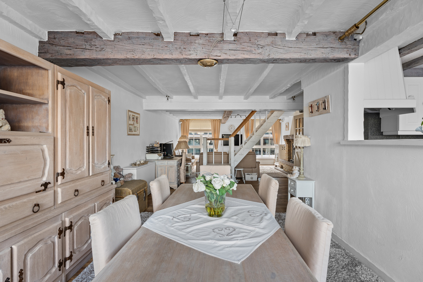 Via de inkomhal met rustieke uitstraling betreedt u een warm interieur met houten vloeren, zichtbare balken en een authentieke gesloten haard. De leefruimte ademt gezelligheid en sluit naadloos aan op de aparte eethoek en de halfopen, volledig uitgeruste keuken met plaats voor een ontbijttafel. Op deze verdieping bevindt zich tevens een extra kamer, momenteel ingericht als dressing, en de badkamer met ligbad en dubbele wastafel.