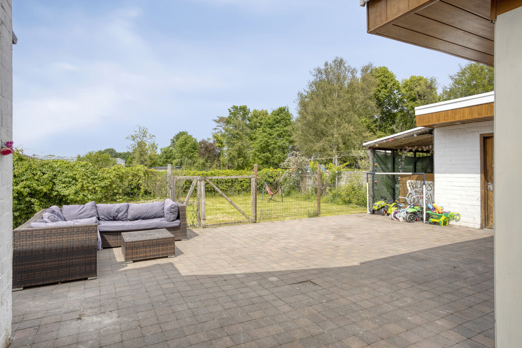 De volledig geïnstalleerde keuken is een troef voor elke thuiskok. Buiten is er meer dan ruimte genoeg om een buitenkeuken of loungehoek te voorzien.
