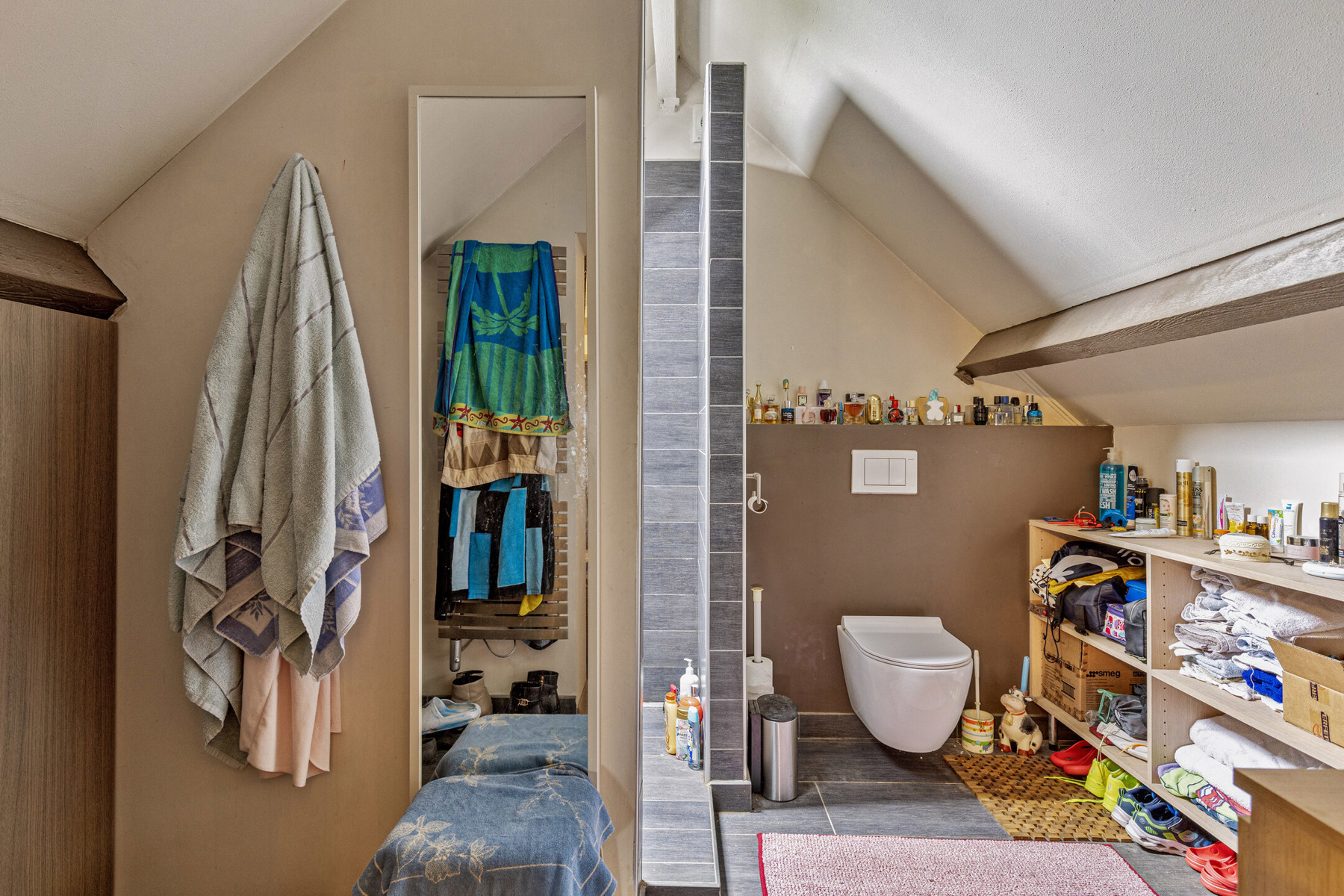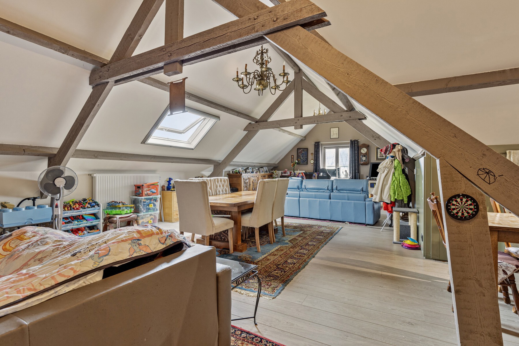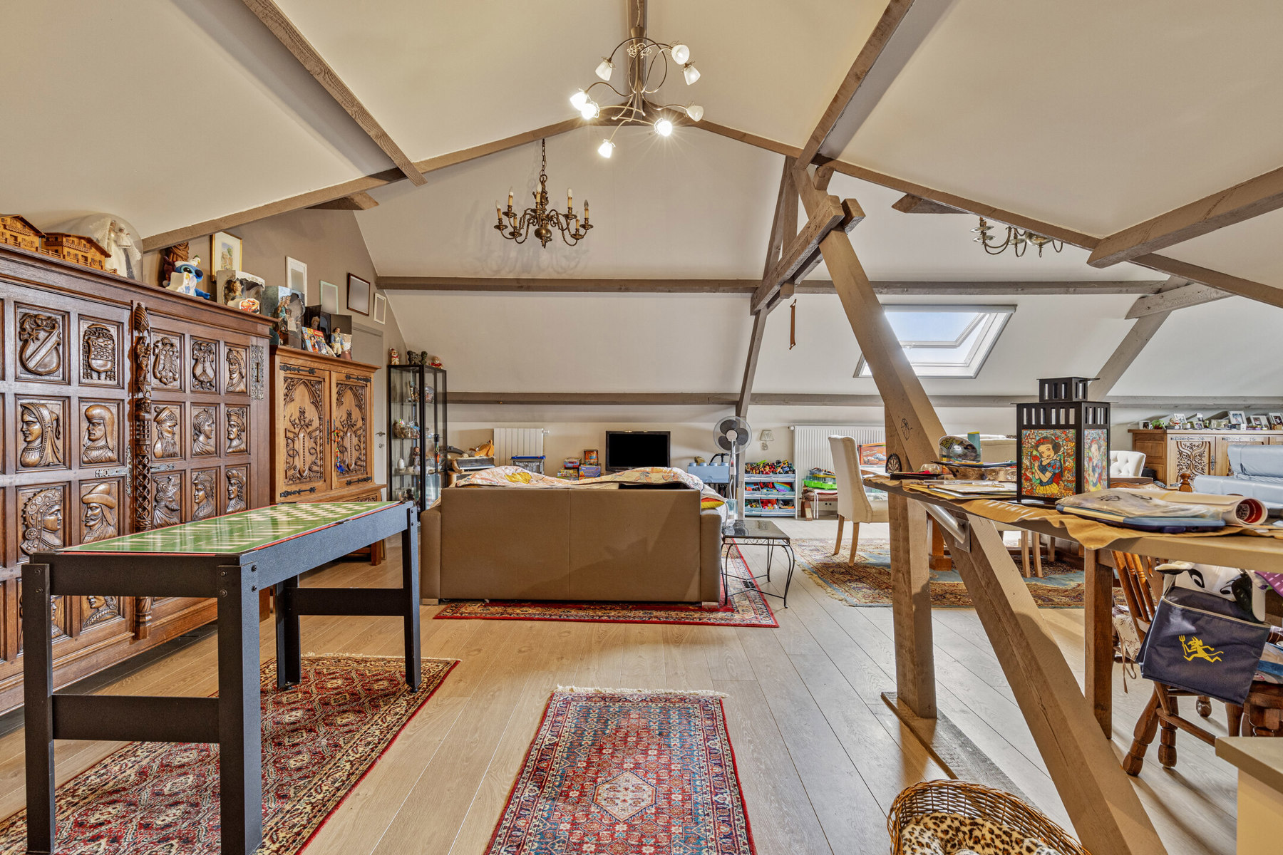 Op de eerste verdieping is er een grote, open ruimte met keuken, 2 slaapkamers en badkamer. De statige, houten dakstructuur siert de woning. Verder is er een vide, die uitkijkt op de eetkamer/living. Momenteel doet deze dienst als bureau.
