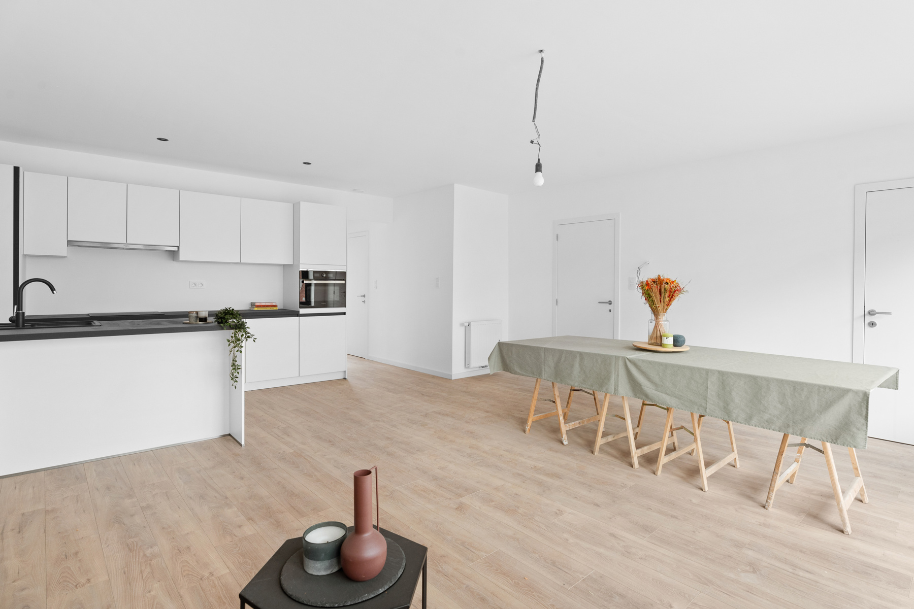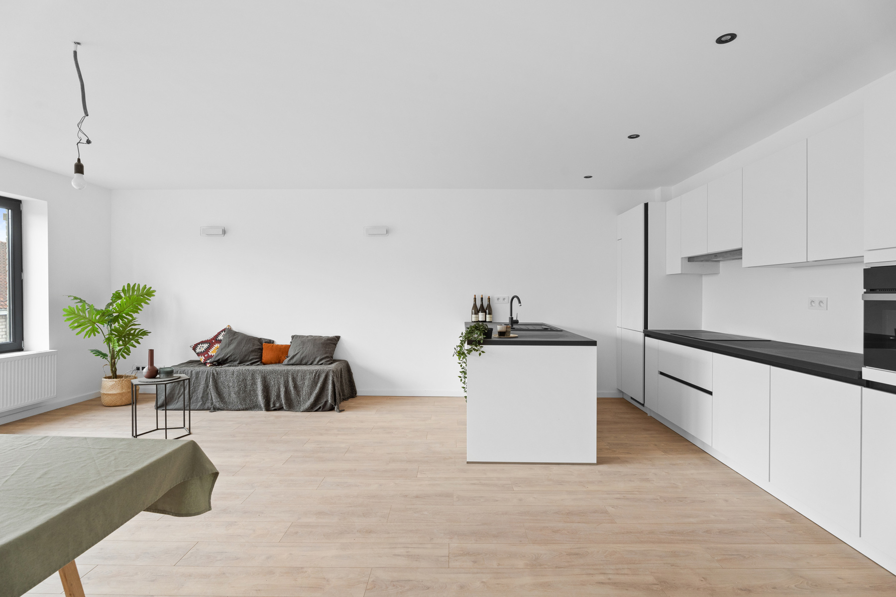 De lichtrijke leefruimte sluit naadloos aan op de open, volledig uitgeruste keuken met hoogwaardige toestellen en veel werk- en opbergruimte.