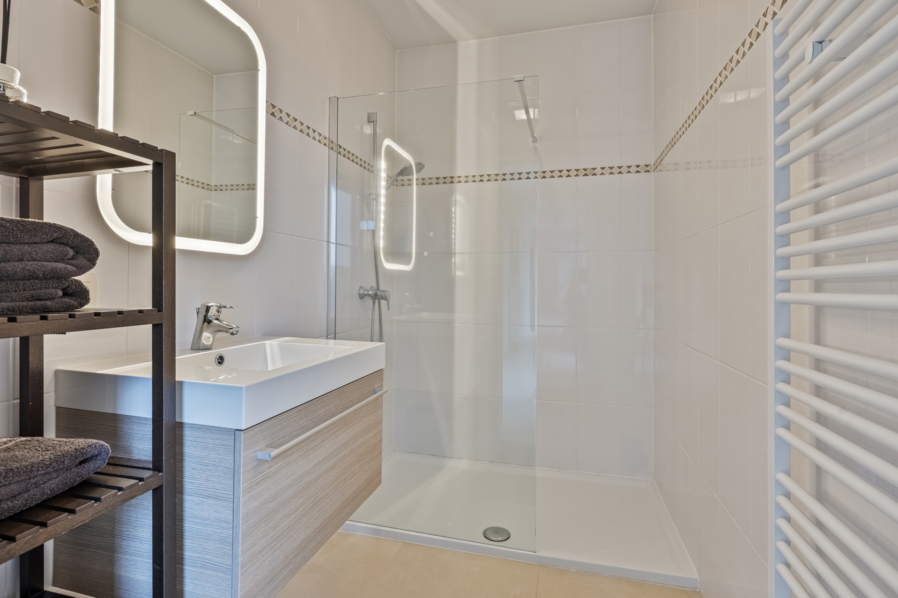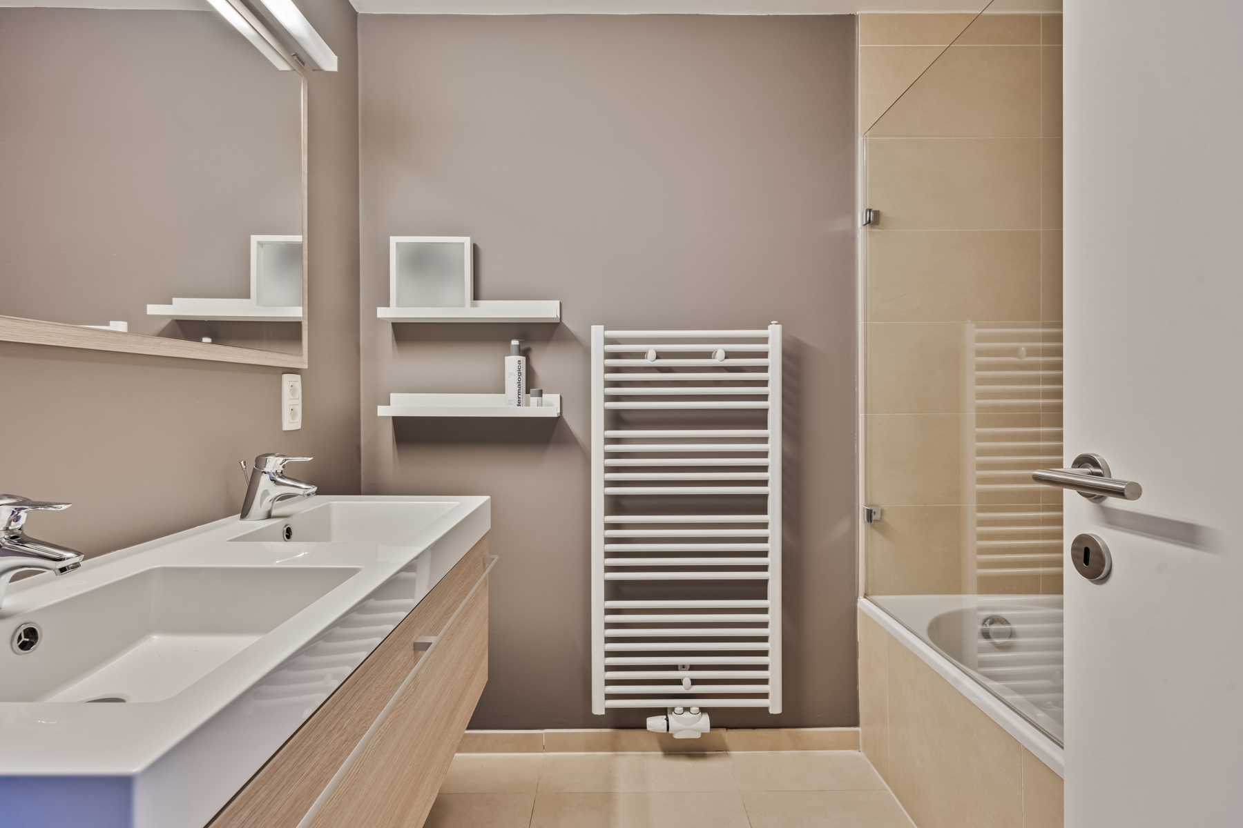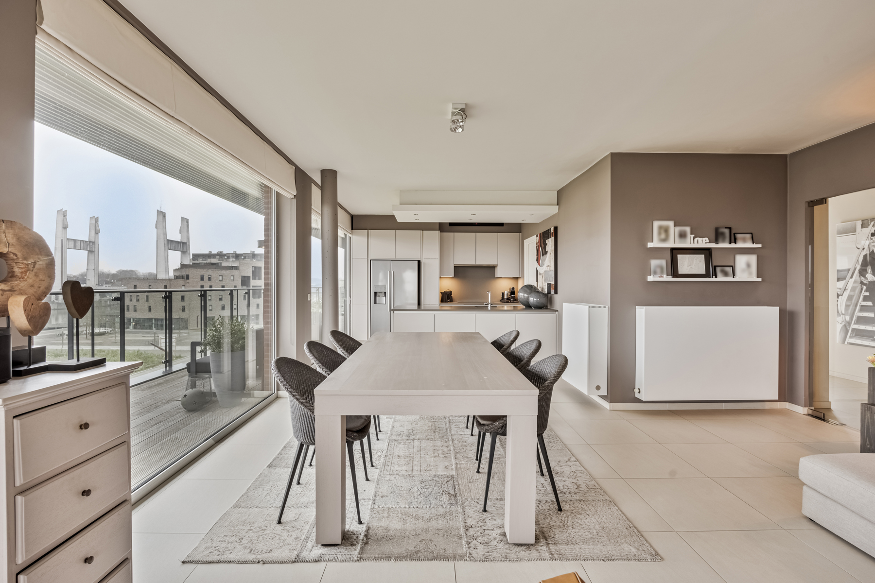 De penthouse beschikt over een royale leefruimte die baadt in het natuurlijke licht en uitkijkt op zowel het water als de skyline van Brussel. De volledig uitgeruste keuken is een toonbeeld van modern design en voorzien van hoogwaardige toestellen. De drie ruime slaapkamers bieden een oase van rust en comfort, perfect voor gezinnen of voor wie op zoek is naar extra ruimte. Daarnaast is er een stijlvolle badkamer met een luxueuze uitstraling en een praktische berging die extra opbergruimte biedt.