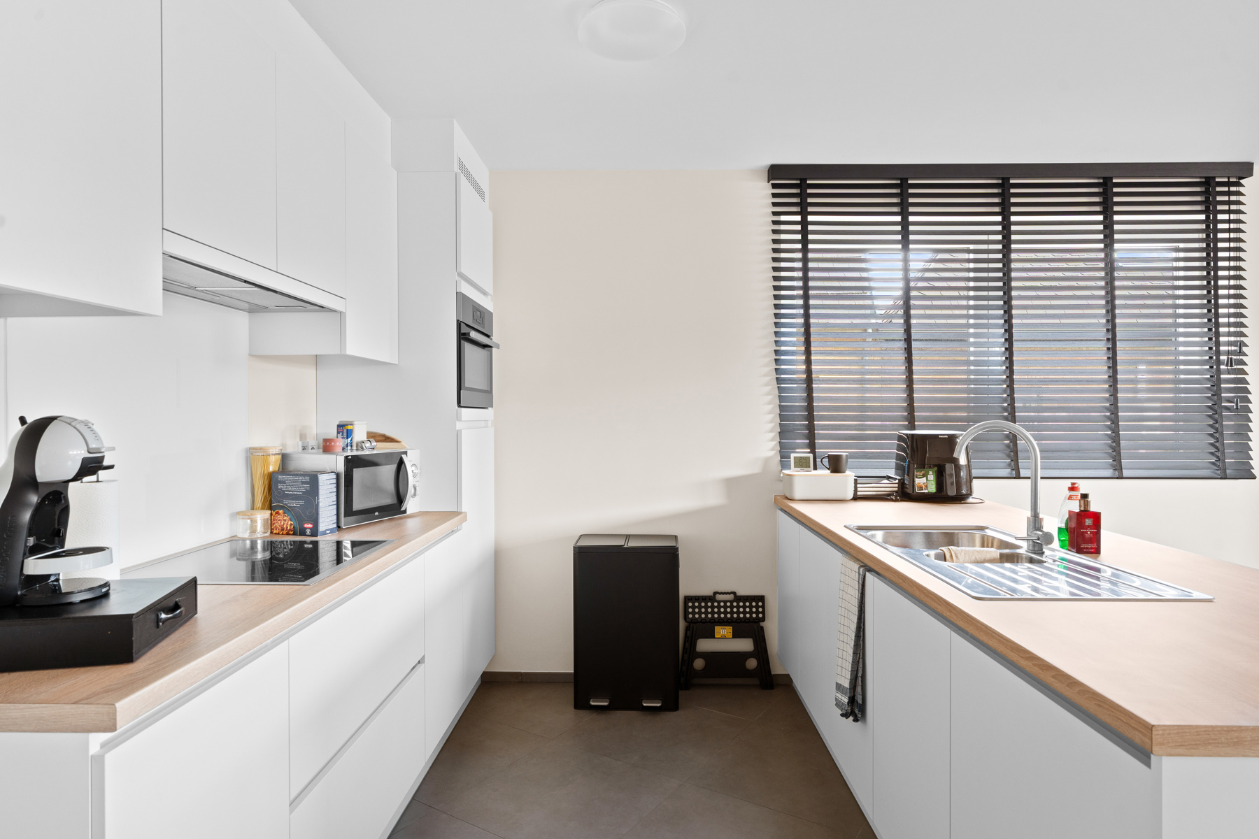 Binnenin beschikt het appartement over twee ruime slaapkamers die flexibel inzetbaar zijn als logeerkamer, bureau of dressing. De lichtrijke leefruimte sluit naadloos aan op de volledig uitgeruste open keuken, wat een gezellige en praktische indeling creëert. Vanuit de leefruimte heeft u toegang tot een aangenaam terras waar u kunt ontspannen in de buitenlucht.