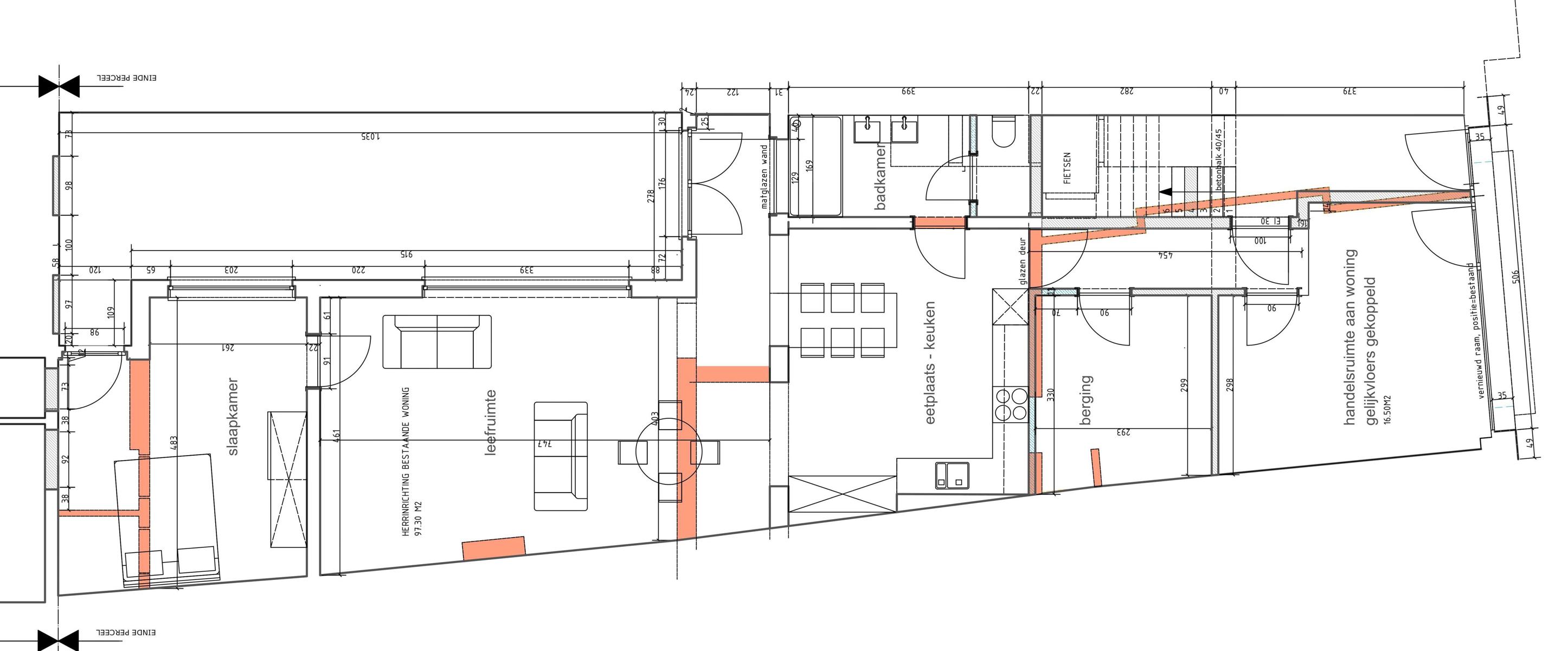 Gelijkvloers: momenteel zijn de ramen vooraan vernieuwd, is er een nieuwe hoofdleiding gas, water en elektriciteit voorzien. De nieuwe, condenserende gasverwarmingsketel werd geïnstalleerd en er is een nieuwe afvoer voor wc, sanitair en cv-ketel. Indeling/afwerking nog zelf verder te bepalen.