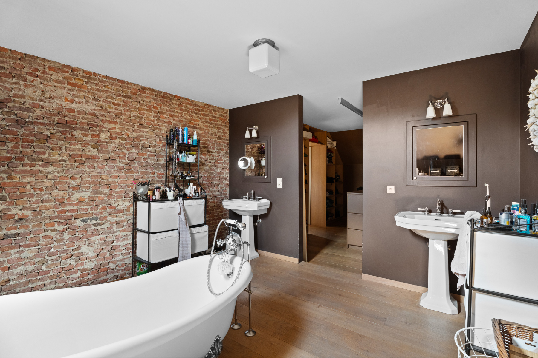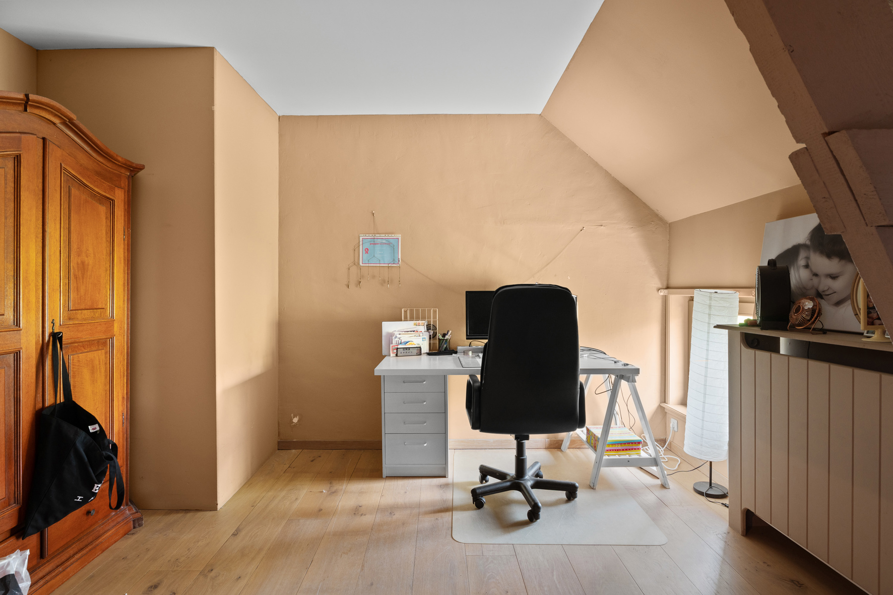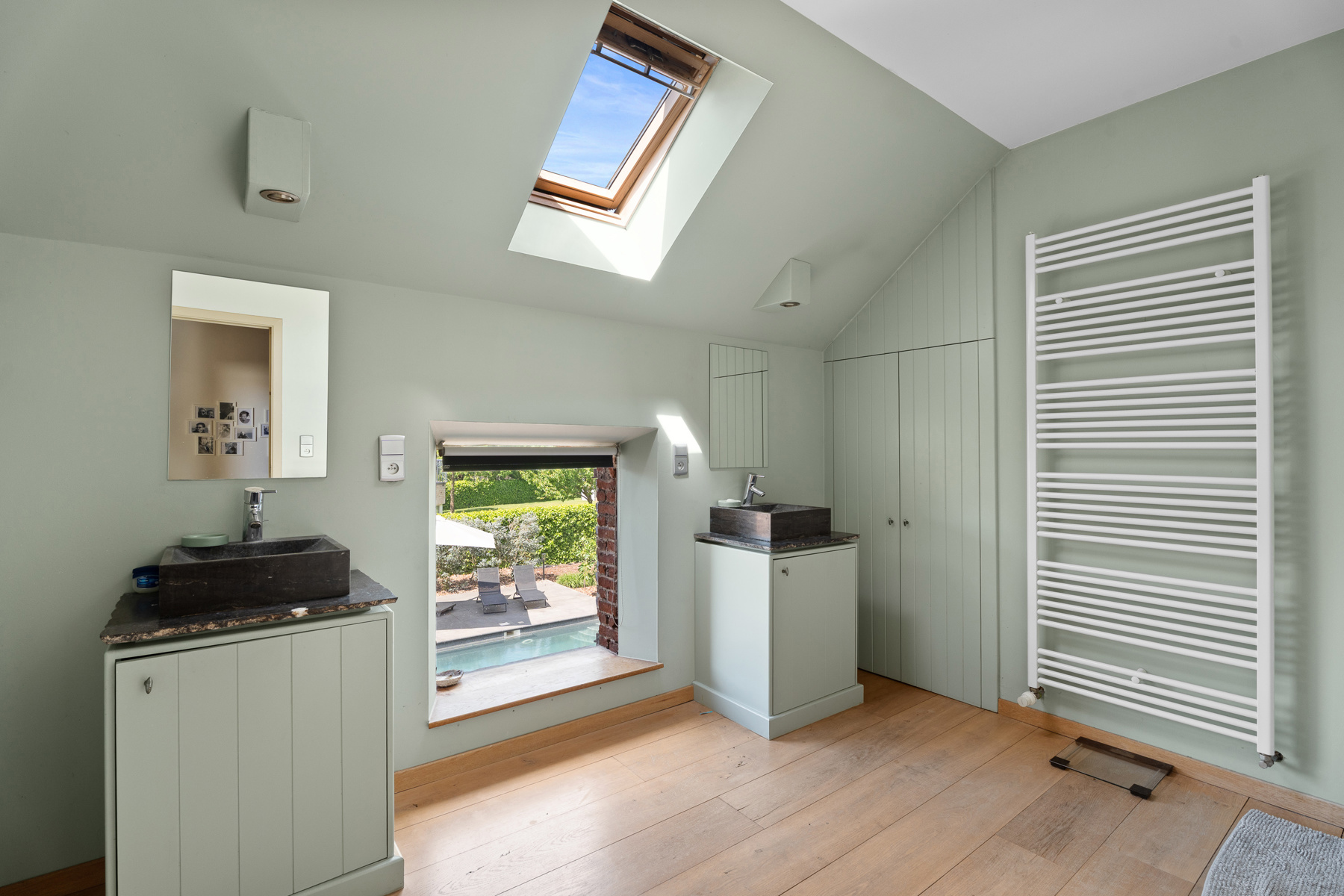 Gelijkvloers beschikt de woning over een zeer ruime bureauruimte van 27,8 m², ideaal voor vrij beroep of kantoor aan huis. Op de eerste verdieping tref je smaakvolle slaapkamers met parket, een masterbedroom met ensuite badkamer en royale dressing. De tweede badkamer kijkt uit op het zwembad – een unieke toets.