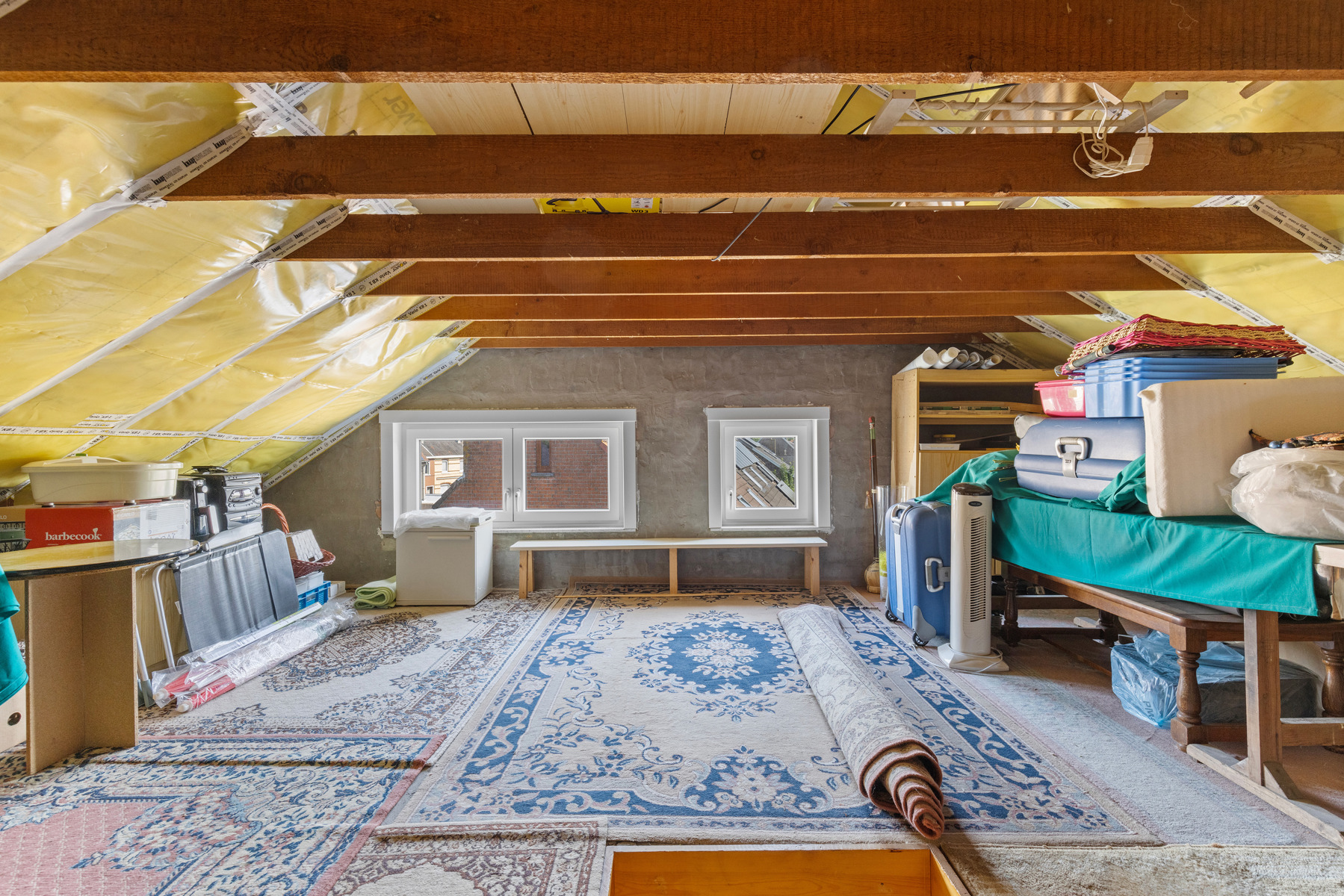 Op de eerste verdieping vind je vier slaapkamers terug, waarvan één momenteel dienstdoet als bureau – ideaal voor thuiswerk of studie. Extra opbergruimte is er in de grote zolder.